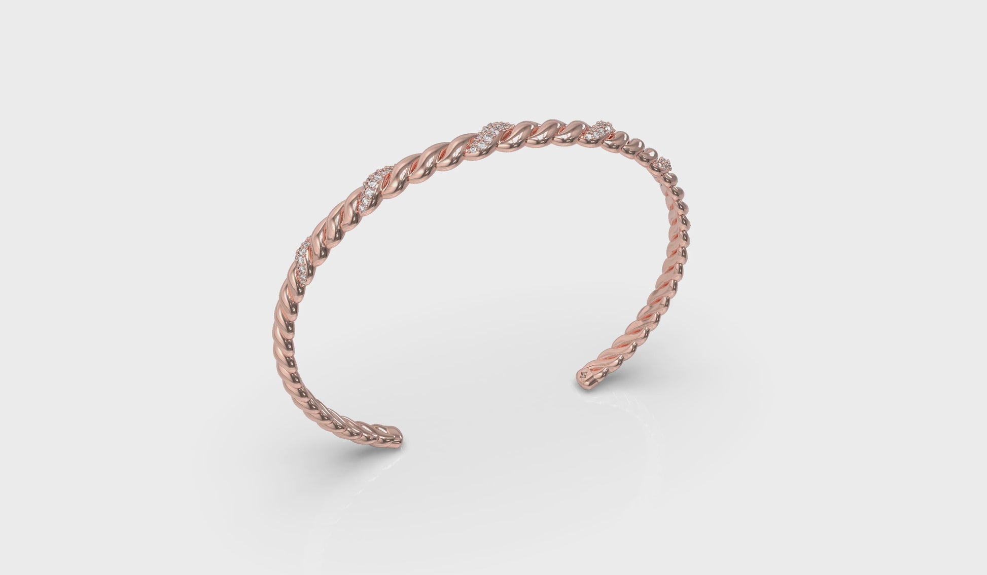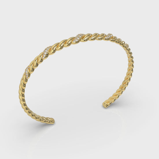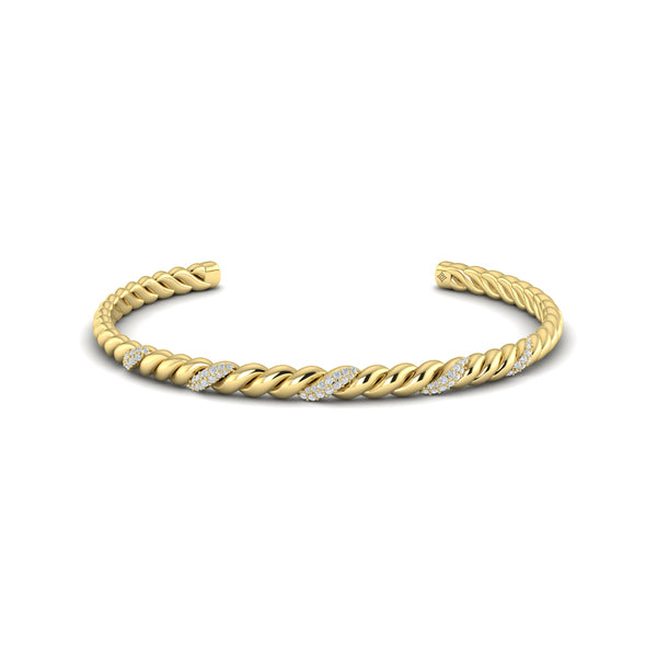 Slender and elegant, this delicate open cuff bracelet has a lovely twisting texture of gracefully spiralling lines. Lines of pave diamonds sparkle in the light like sunlight gleaming on the crest of a wave. Delicate yet with an undeniable presence, it adds a touch of the relaxed elegance of the beach to every day.