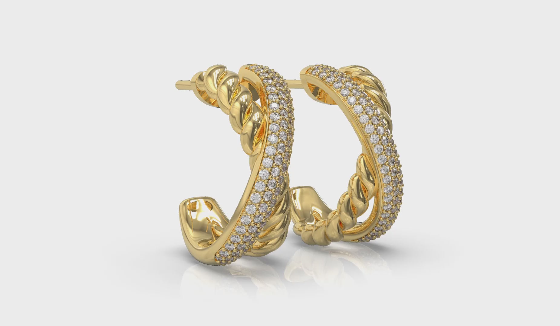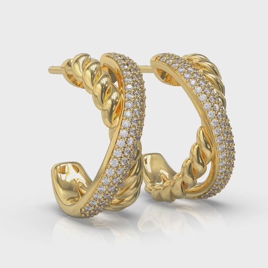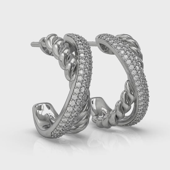 Bold and beautiful, the crossed strands of these hoop earrings shine and sparkle. One strand celebrates the eternal brilliance of diamonds, reflecting your strength. The other is coiled with twisted texture, symbolizing resilience. This mirror-image design frames your face beautifully. These sparkling diamond hoop earrings will always remind you that your heart knows the way.
