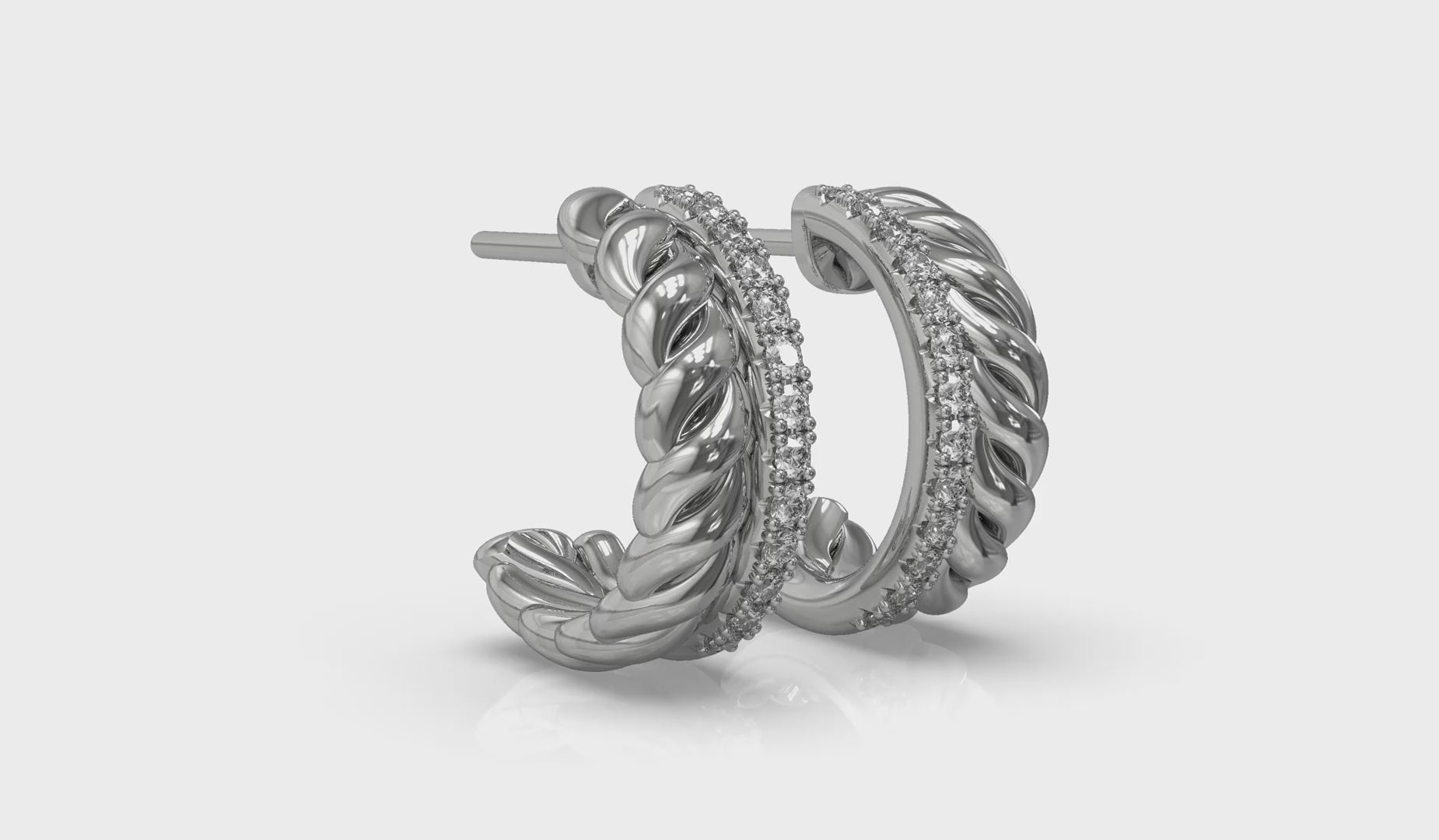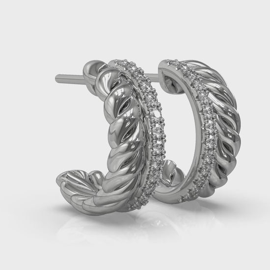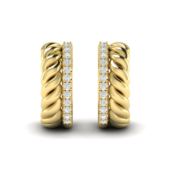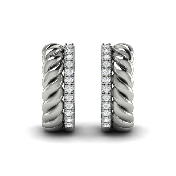 Like beautifully stacked rings, these stylish hoops are doubly delightful. Powerful twisted strands add sculptural dimension and a line of sparkling diamonds adds brilliance and fire. The meticulously crafted mirror-image right and left facing design frames your face in gleaming light. Timeless and distinctive, these versatile hoops are sure to be your signature.
