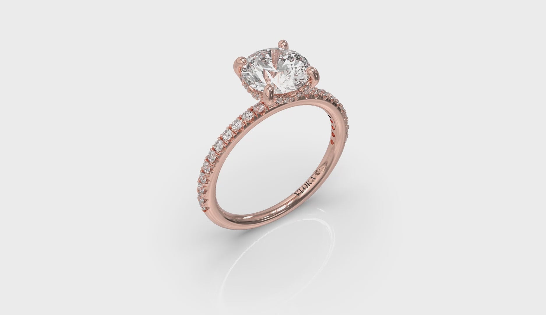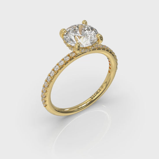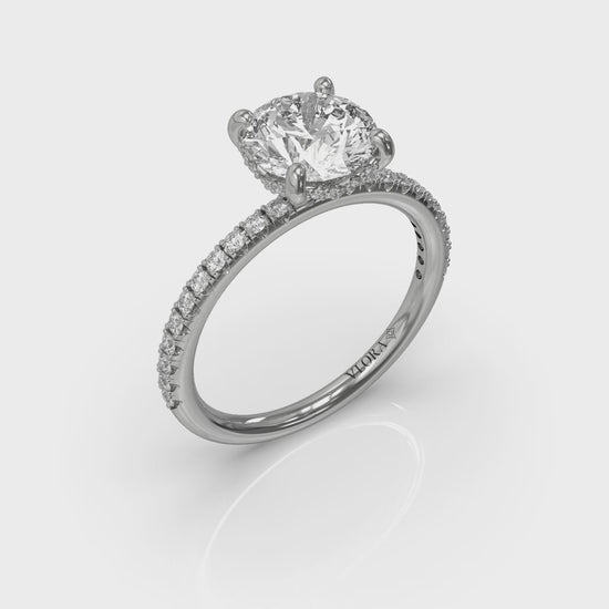 Elegance is always in fashion. This classic engagement ring dances with brilliance from every angle. The center round brilliant diamond is elevated to gather light in Vlora's signature V-shaped setting. A surprise diamond hugs the curves of the setting adding drama to the side profile. A stylishly slim and delicate diamond band sparkles across the finger, with beautifully matched accent diamonds. This perfect fit engagement ring is designed so your wedding band will stack beautifully. Your journey to forever begins here, with elegance in every facet.