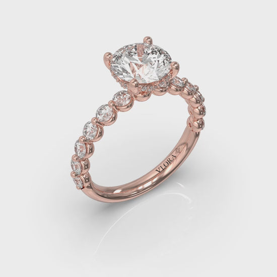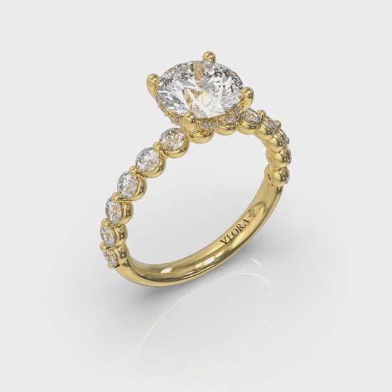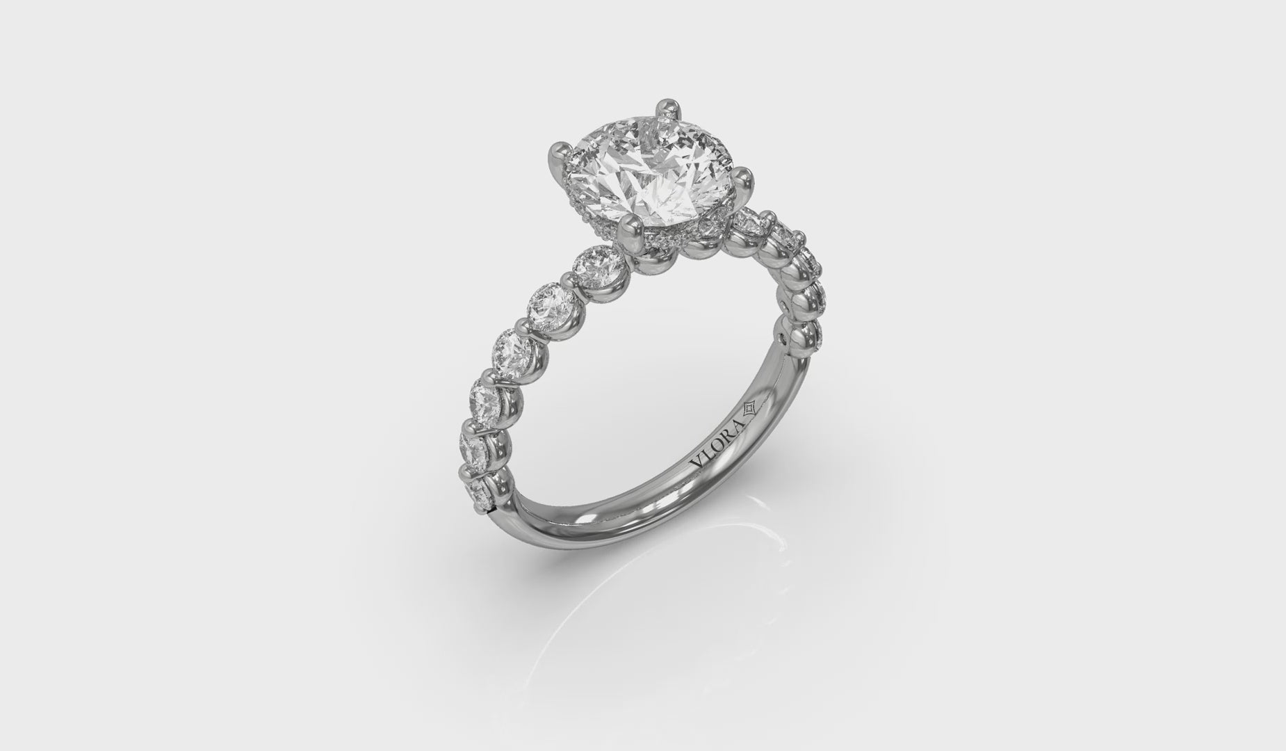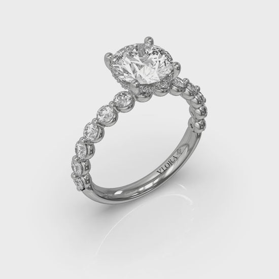 Weightless brilliance, designed to turn heads. Wearing this lovely hidden halo engagement ring all you see is sparkle. The round center diamond is lifted in our signature V-shaped setting to allow light to enter from every angle. The shared prong diamond band has gems that seem to float over your finger, thanks to a meticulously crafted hidden band below. A hidden halo adds additional delightful detail to the side view. This classic engagement ring is ideal for a love story that deserves nothing but brilliance.