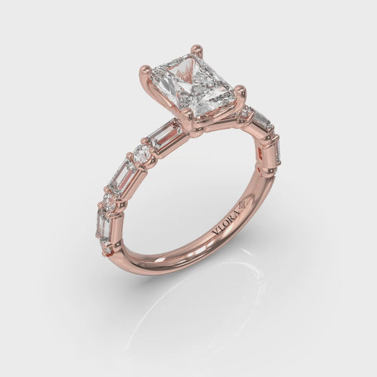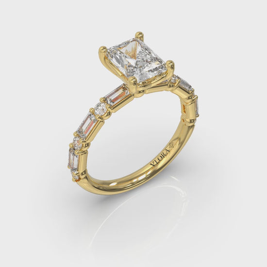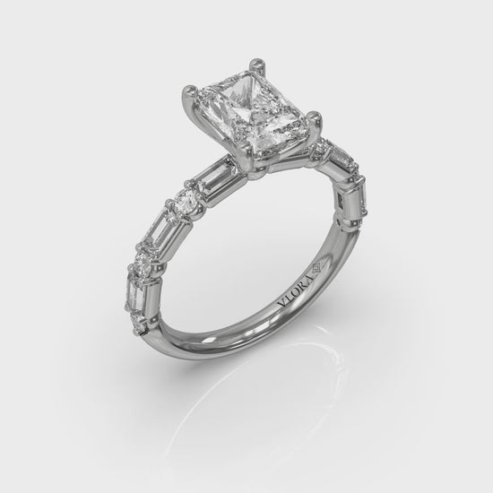Like a bold skyscraper catching the sun, this Art Deco inspired diamond emerald cut engagement ring design flashes with fire and brilliance. The geometry lesson begins with the center emerald cut diamond, with long facets beautifully reflecting each other. The band has alternating baguette and round diamonds creating a rhythmic tribute to the jazz age. Timeless and modern, this classic engagement ring design will look just as beautiful a century from now.