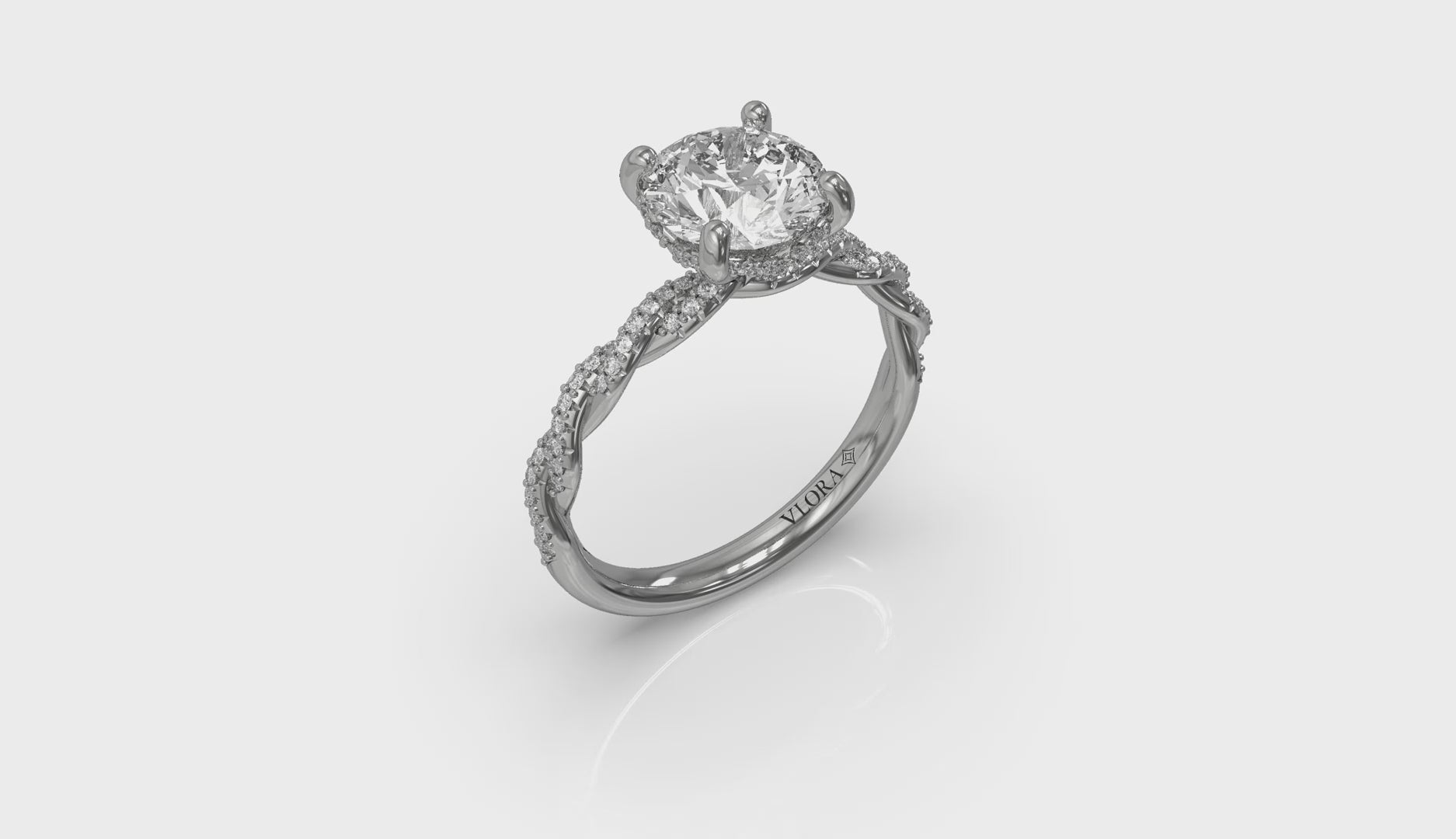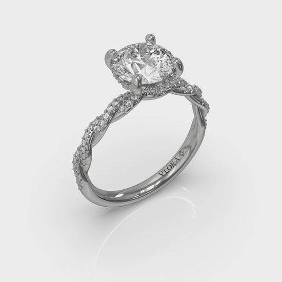 The delicate twisting design of this romantic hidden halo round engagement ring celebrates two lives becoming one. Sparkling pave diamonds symbolize the lasting power of love to make every day more brilliant. The center round brilliant diamond is elevated to gather light in Vlora's signature V-shaped setting. A hidden halo adds extra sparkle to the profile view. There's no better way to celebrate all the ways your lives are now entwined.