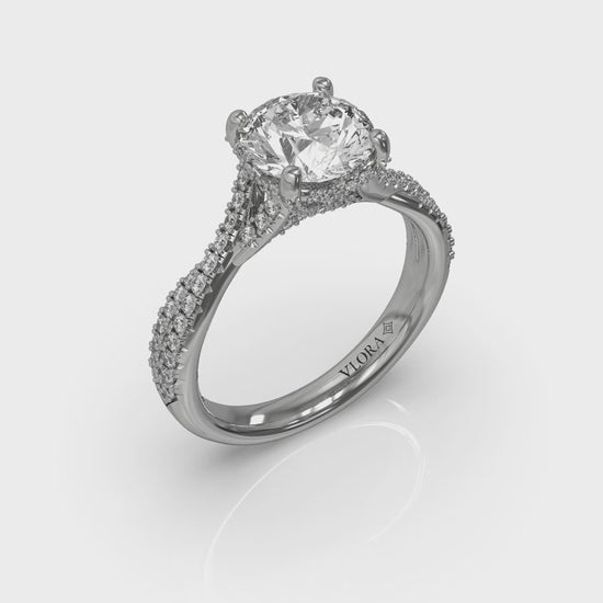Experience intricate beauty with a crossed pave split shank engagement ring. A shimmering cathedral setting with a hidden halo accentuates a round diamond. Woven details and pave diamond prongs elevate the design, while Vlora's signature V-shaped setting invites radiant light, symbolizing how love joins two paths into one.