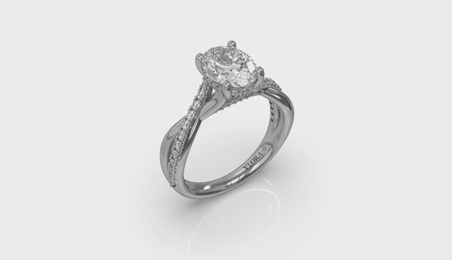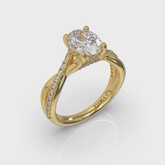 Revel in refined beauty with this oval hidden halo engagement ring, featuring a crossed double shank with one strand polished and one strand adorned with pave diamonds. A hidden halo and woven details add depth, while pave diamond prongs enhance ithe brilliance of the graceful center oval diamond. This stunning split shank oval engagement ring design symbolizes the harmony love brings to life.
