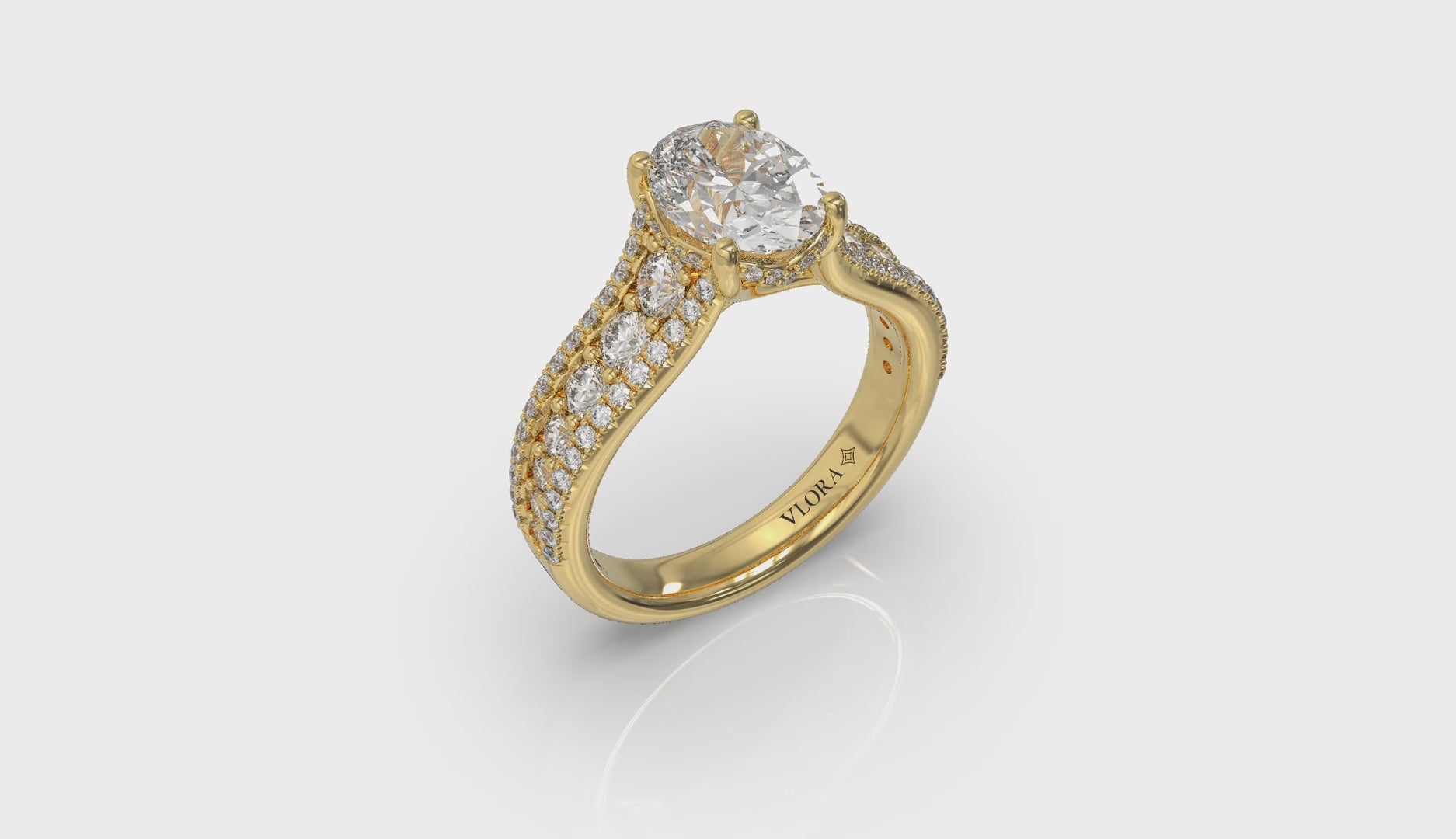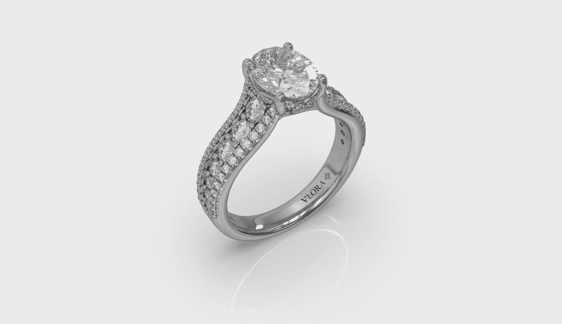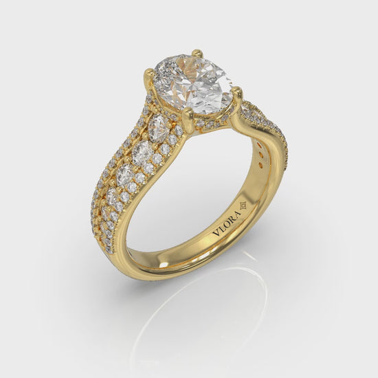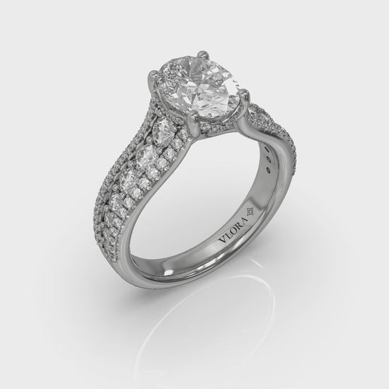 This stunning hidden halo oval engagement ring makes a strong statement The graceful oval diamond takes center stage, nestled in Vlora's V-shaped setting. A dramatic three-row diamond band, featuring eye-catching central stones, dazzles with brilliance. The hidden halo accentuates the sparkle, making this oval diamond engagement ring a timeless celebration of love and luxury.