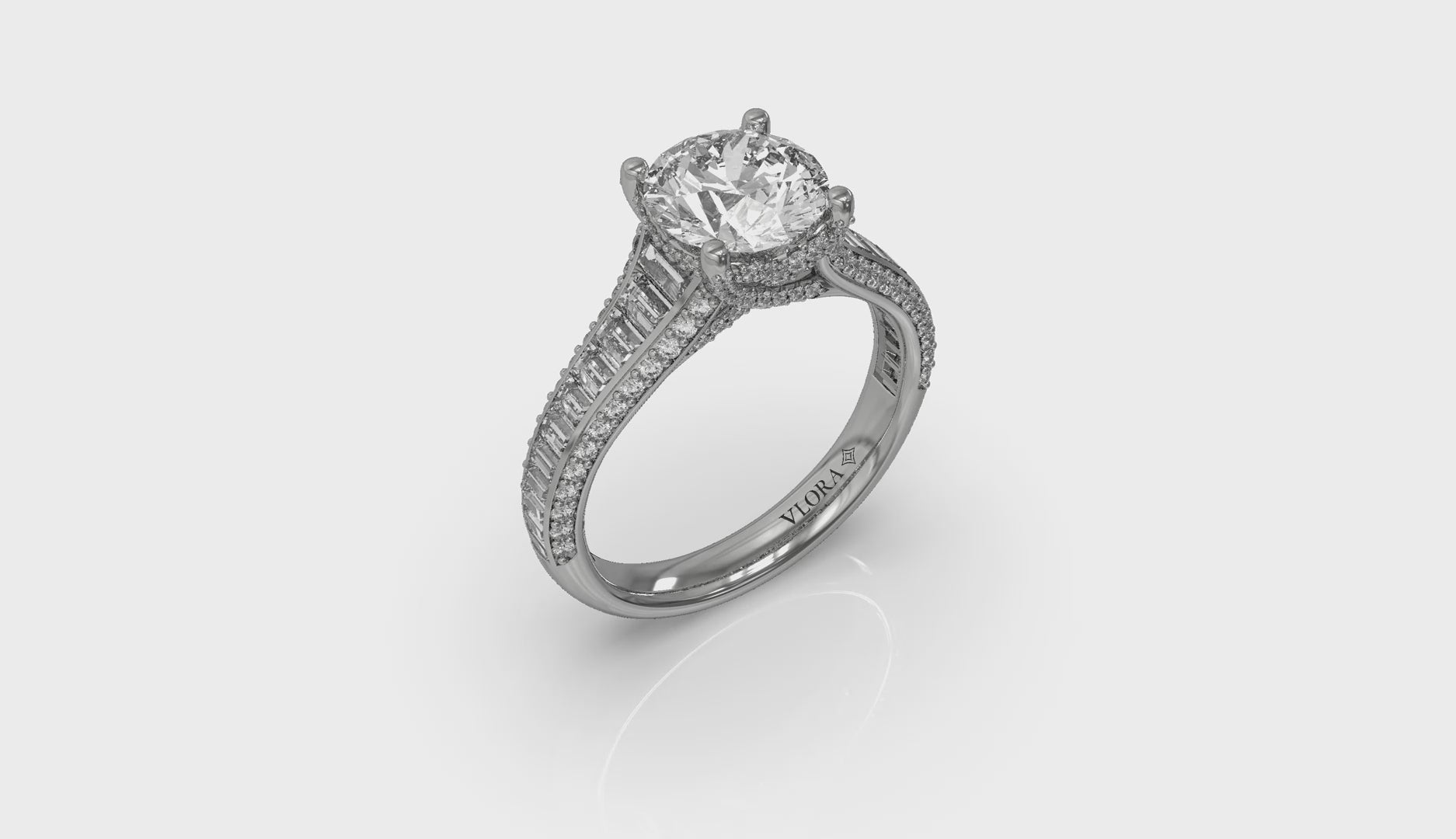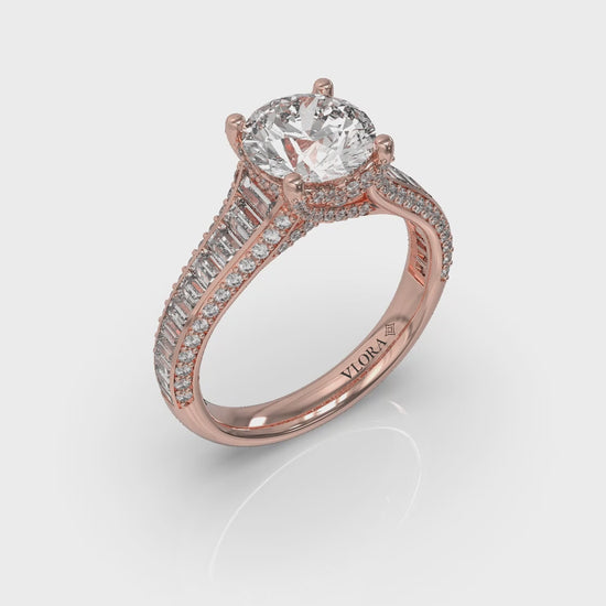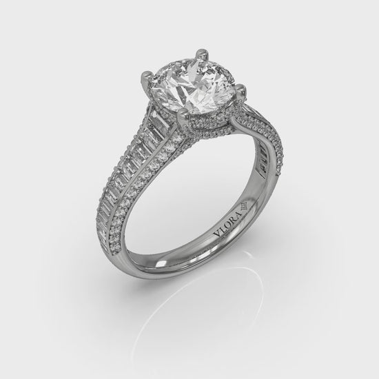 Experience opulence with this diamond unique engagement ring that is a masterpiece of the jeweler's craft. Lavish channel-set vertical tapered baguettes are accented by lines of round diamonds on the band’s beveled sides. The cathedral design rises to meet the center round diamond, capturing light brilliantly in Vlora's signature V-shaped setting. The hidden halo, pave detailing and pave diamond prongs add layers of sparkle, epitomizing the heights of luxurious elegance.