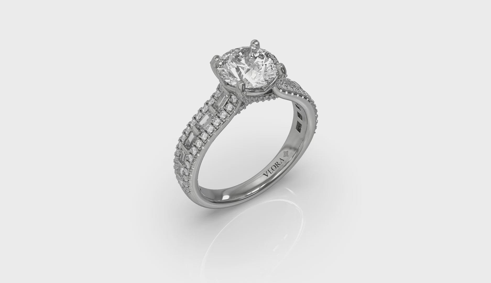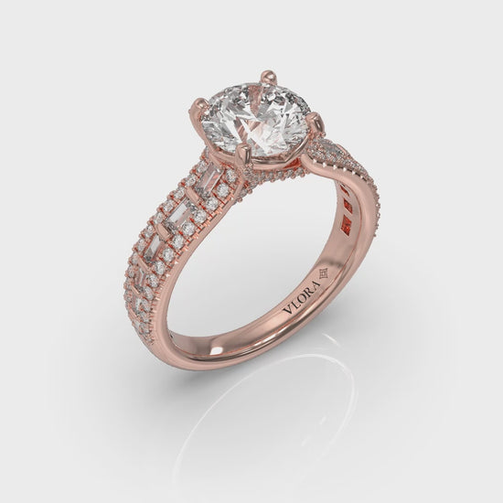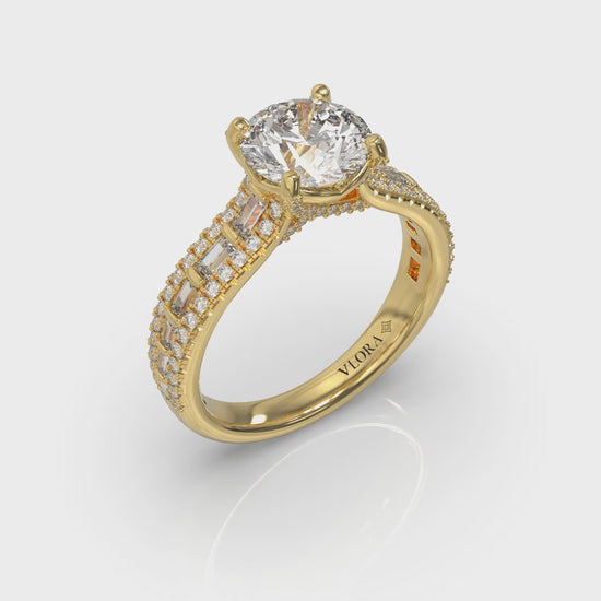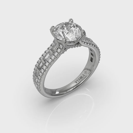 A celebration of love, this dramatic cathedral round diamond engagement ring makes a statement. A bold three-row diamond band sparkles with captivating interplay between emerald cut and round diamonds. The round center diamond sparkles in Vlora's signature V-shaped setting. Hidden pave diamond details and prongs enhance its brilliance, creating an elegant symbol of timeless love.