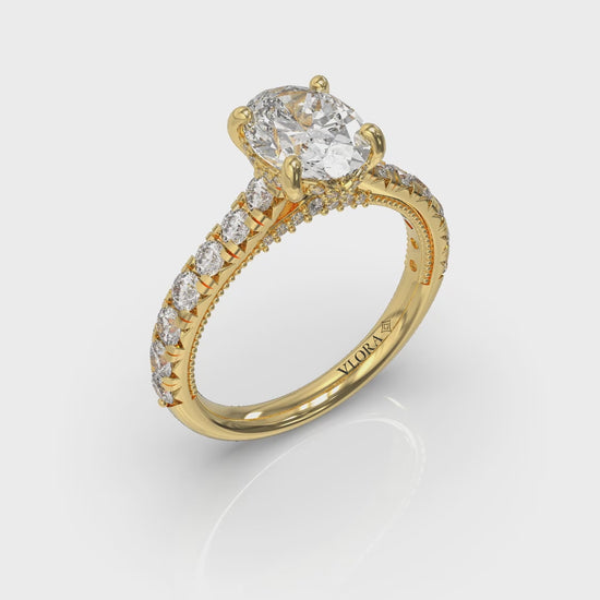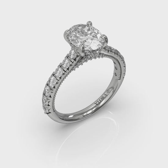 As beautifully made as a classic vintage engagement ring, this oval diamond engagement ring has meticulously crafted details that elevate its design. The Vlora signature V-shape setting raises the center diamond to catch the light and every eye. French pave diamonds on the cathedral band have extra cut-outs to let light set them on fire as well. Millegrain and delicate diamond pave detailing on the profile adds sparkle and a vintage flair, creating an engagement ring that's sure to be a family heirloom.