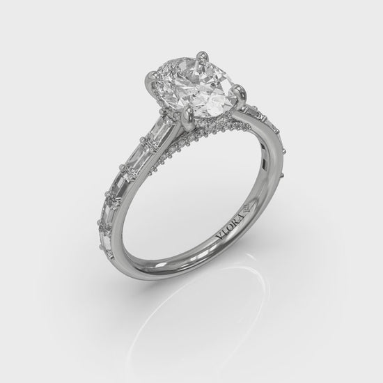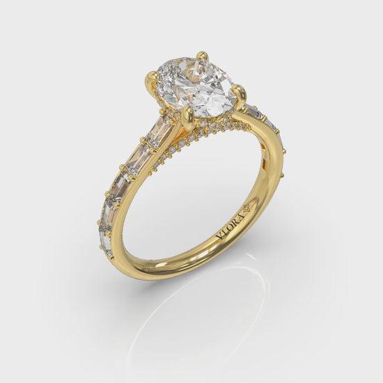 This stunning hidden halo oval engagement ring combines modern elegance with timeless beauty. An oval center diamond sits in the Vlora signature V-shaped setting, enhanced by a hidden halo. The baguette diamond band rises into a cathedral design, while delicate accent diamonds add brilliant allure to the profile. The harmony of reflections creates an unforgettably brilliant celebration of your love story.