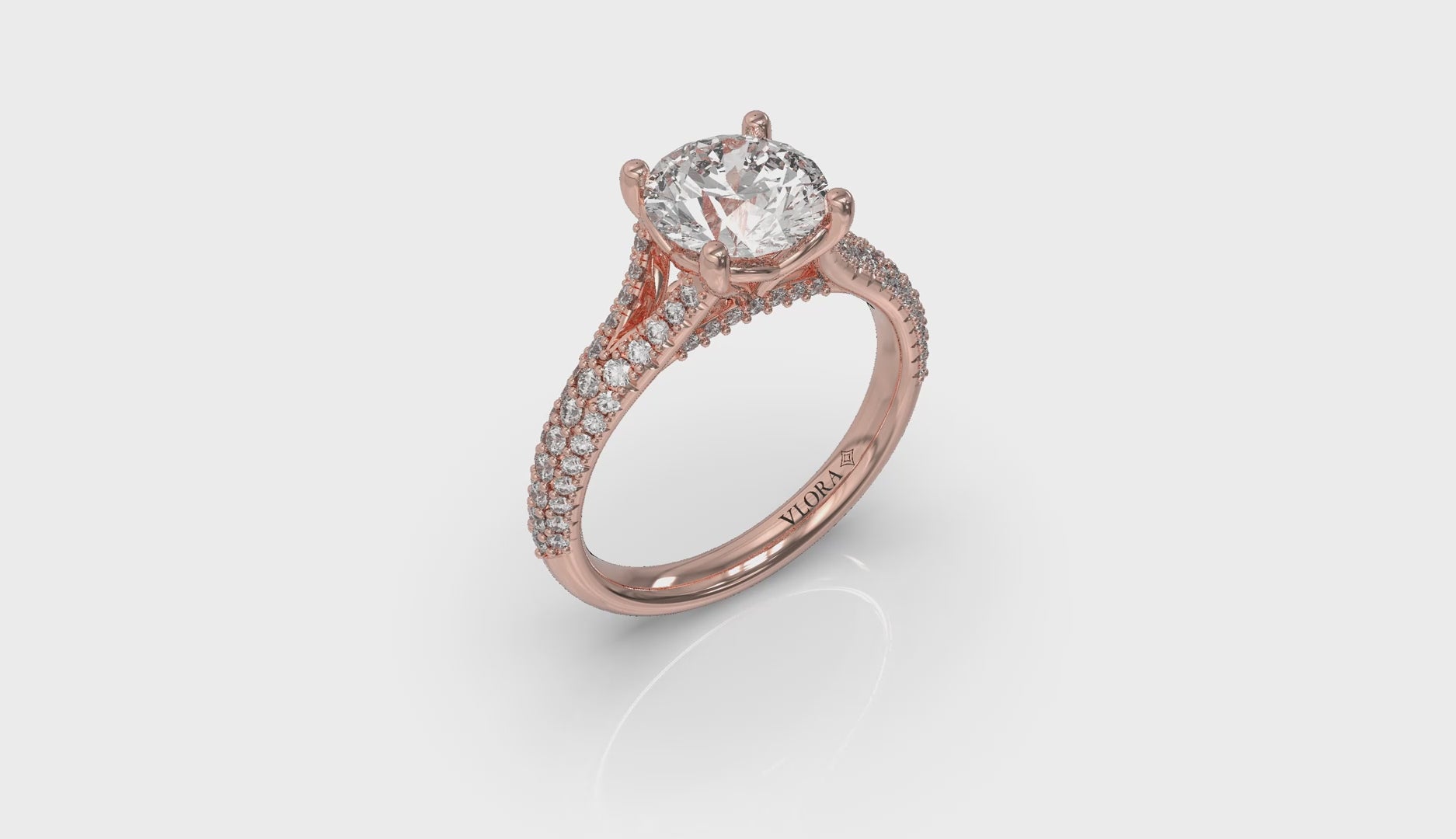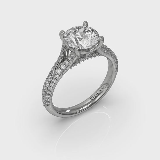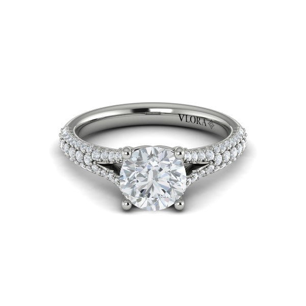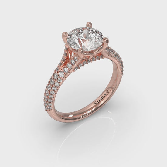 This stunning classic diamond engagement ring features a split shank pave diamond band in an elegant cathedral setting that embraces the round center diamond, beautifully elevated in Vlora's signature V-shaped setting. Delicate diamond details underneath the center stone create a harmonious blend of sparkle and sophistication.