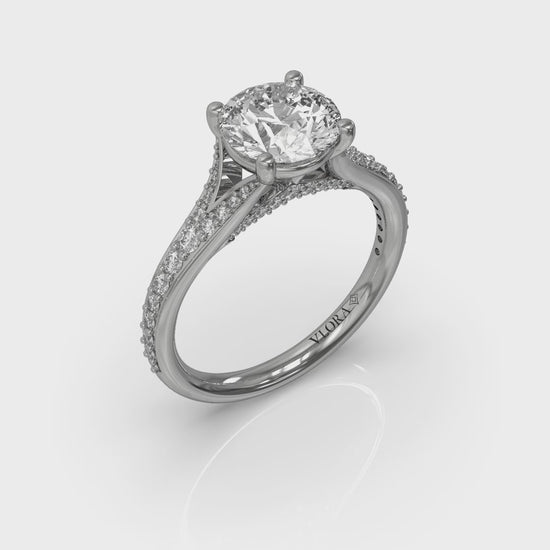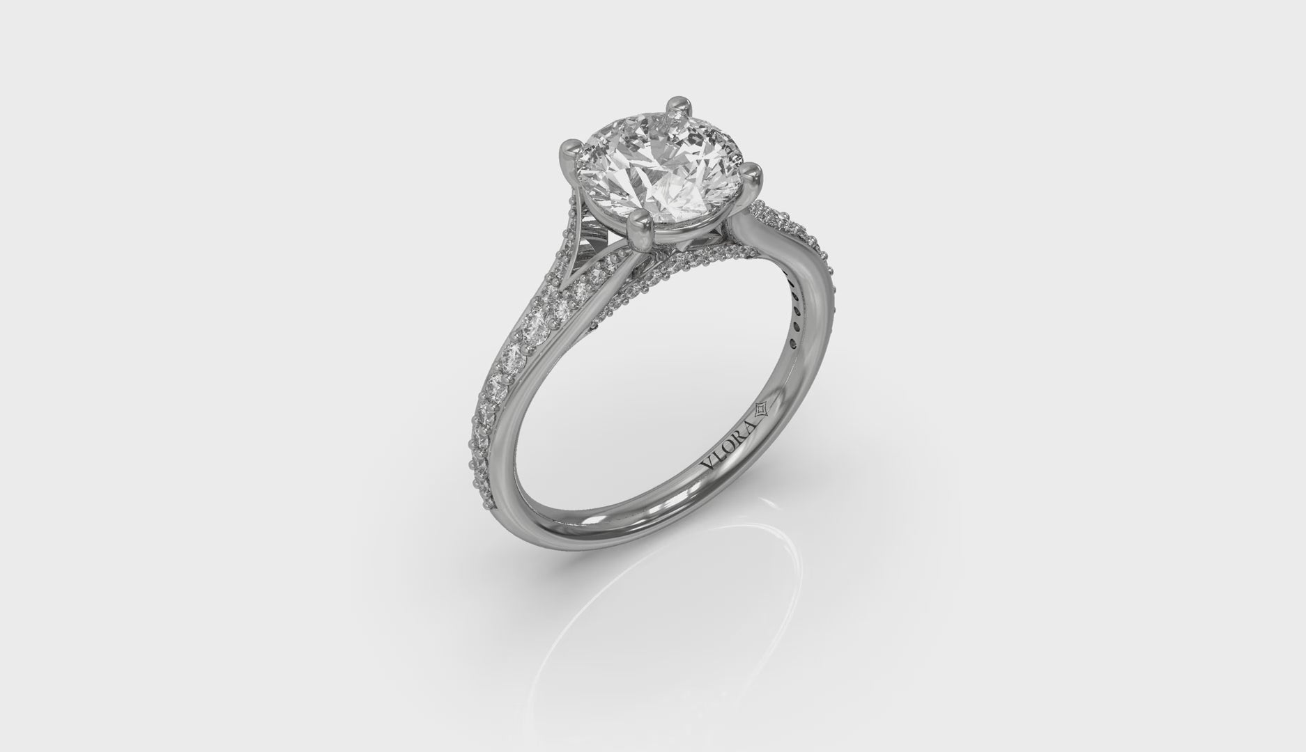Celebrate love with this elegant split shank diamond engagement ring. The diamond band rises like two arms holding the round center stone, a beautiful celebration of love's timeless embrace. Diamond details on the profile add an extra touch of magic. It's a beautifully crafted tribute to a love that will last a lifetime.