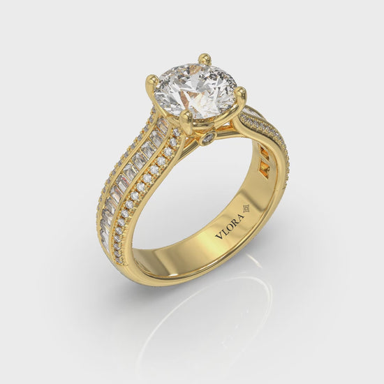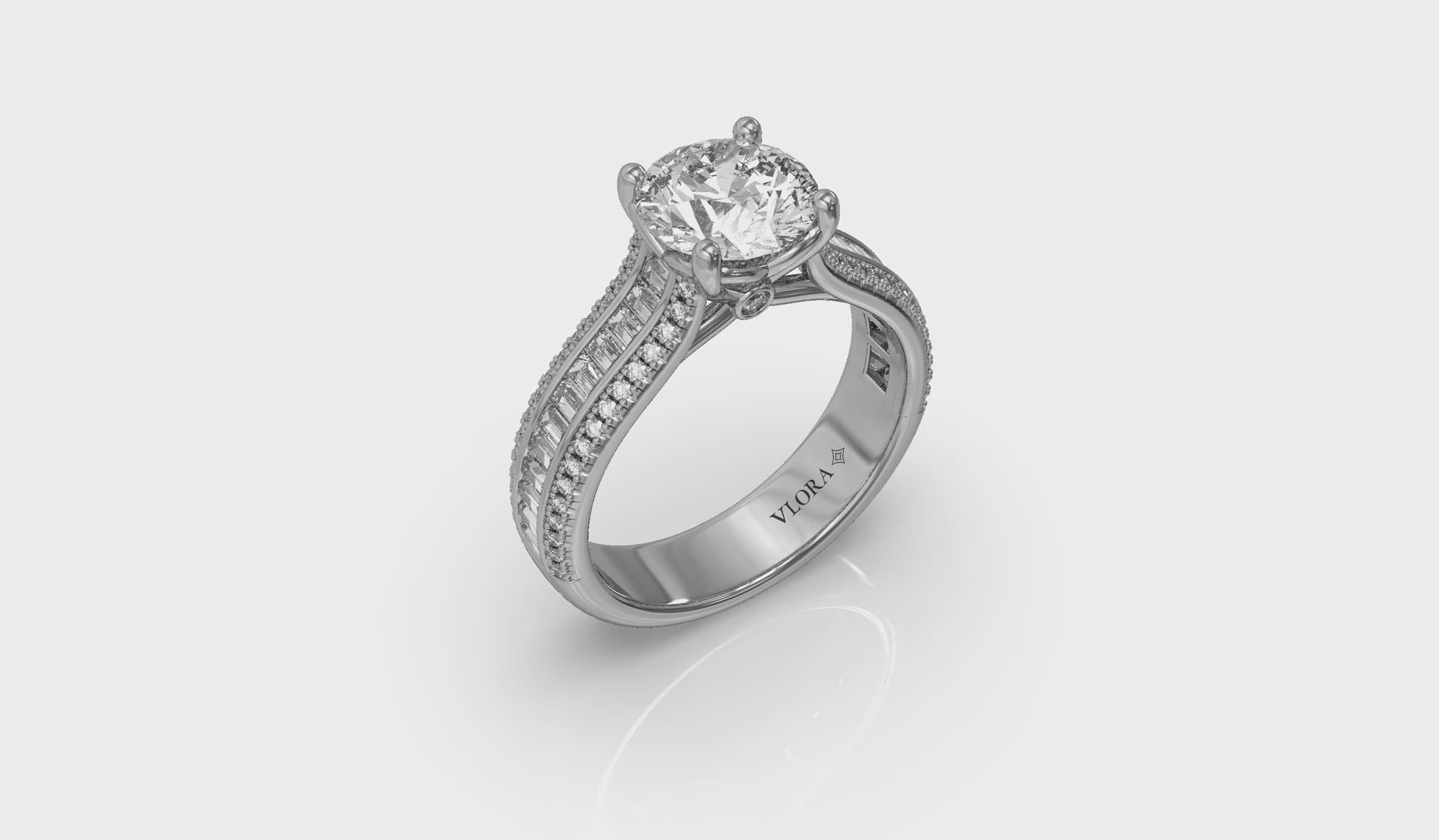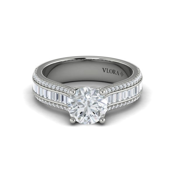 Experience opulence with this unique engagement ring that is a masterpiece of the jeweler's craft. Lavish channel-set vertical tapered baguettes are accented by lines of round diamonds on the band’s beveled sides. The cathedral design rises gracefully to meet the center round diamond, capturing light brilliantly in Vlora's signature V-shaped setting. A hidden bezel set diamond under the center stone adds sparkle to the profile, an extra touch of luxury to this timeless celebration of love's brilliance.