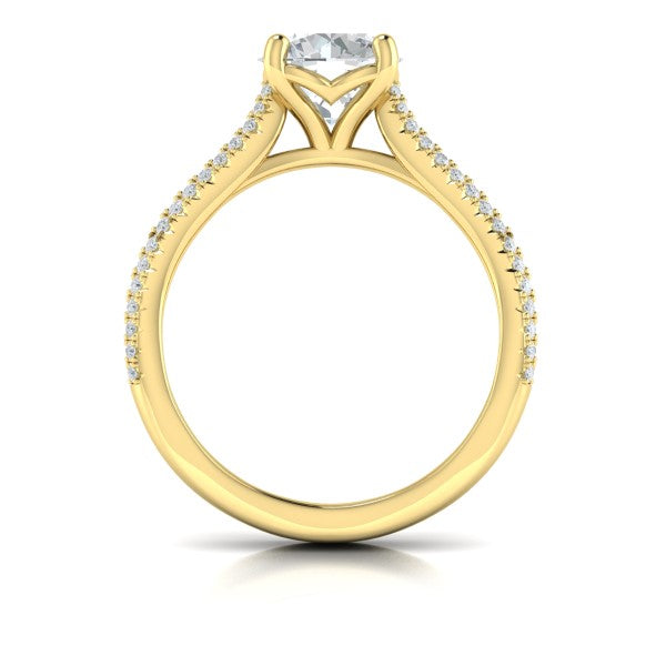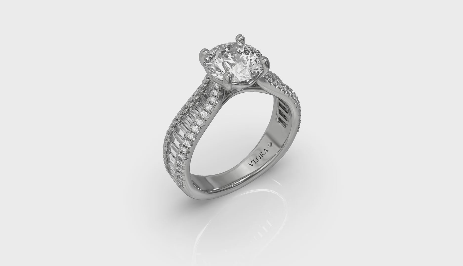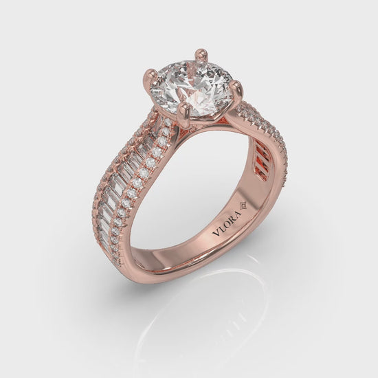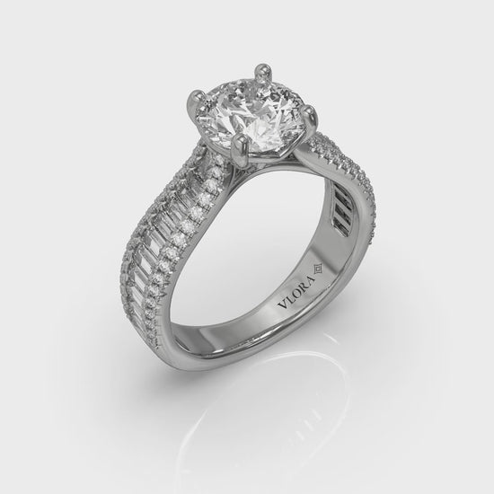 Celebrate your love with this unique engagement ring. The round center diamond, held aloft in a Vlora signature V-shaped setting, captures light brilliantly. An innovative three-dimensional channel set baguette diamond band completes this cathedral masterpiece, creating a mesmerizing symphony of sparkle and timeless elegance.