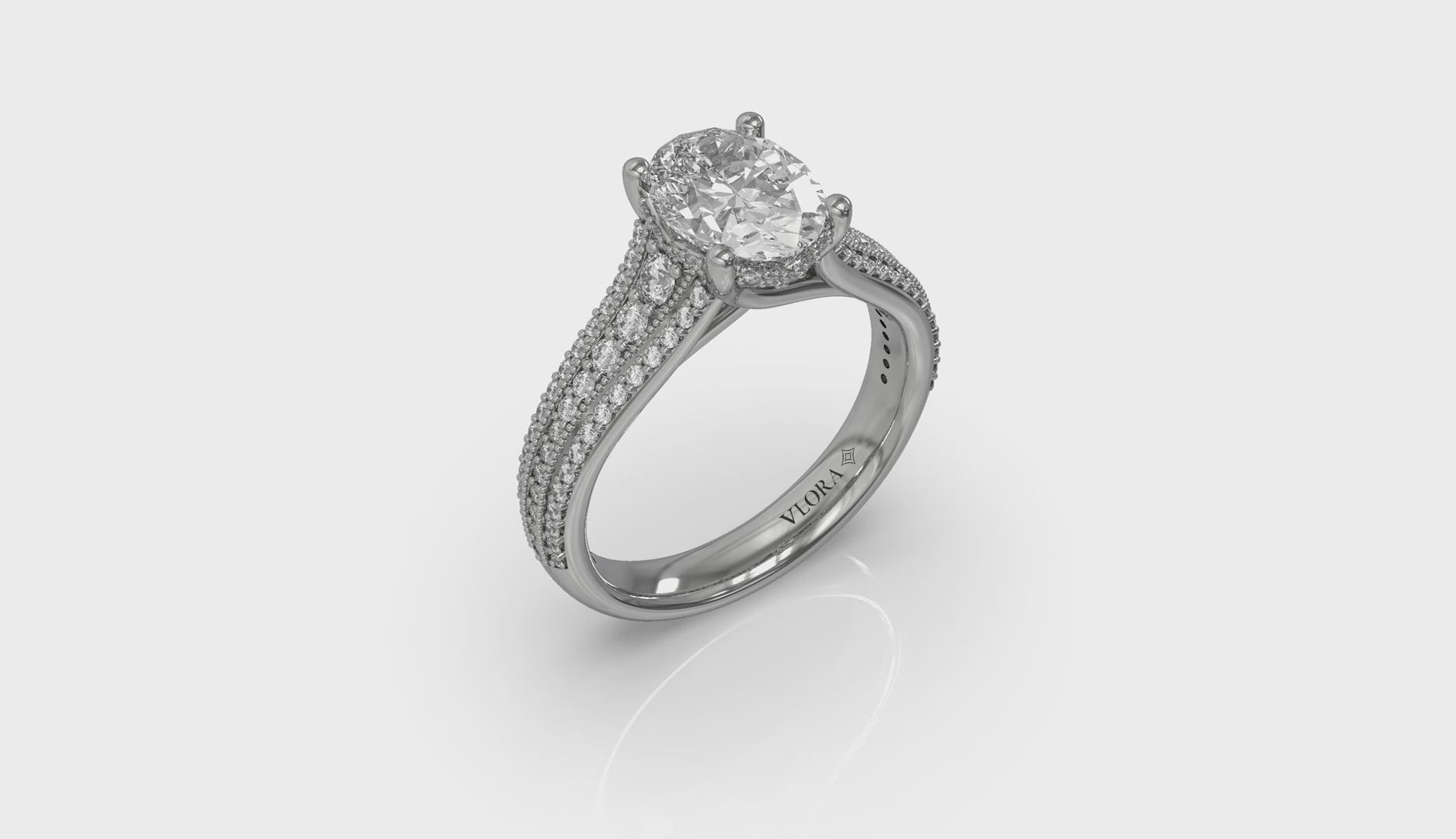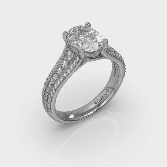 Immerse yourself in timeless romance with a modern vintage engagement ring. A tapered triple-row diamond band, with larger central stones and millegrain touches, exudes vintage charm. The hidden halo and cathedral setting illuminate your love story. This beautifully crafted oval hidden halo engagement ring is a classic tribute to everlasting elegance.