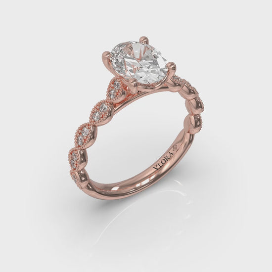 Celebrate unity and love with this enchanting diamond engagement ring. An oval center diamond sits gracefully in Vlora's signature V-shaped setting, capturing light like a beacon. The unique beaded band hugs your finger, adorned with pave-set diamonds that pair two by two, like peas in a pod, representing the harmony of your intertwined lives.