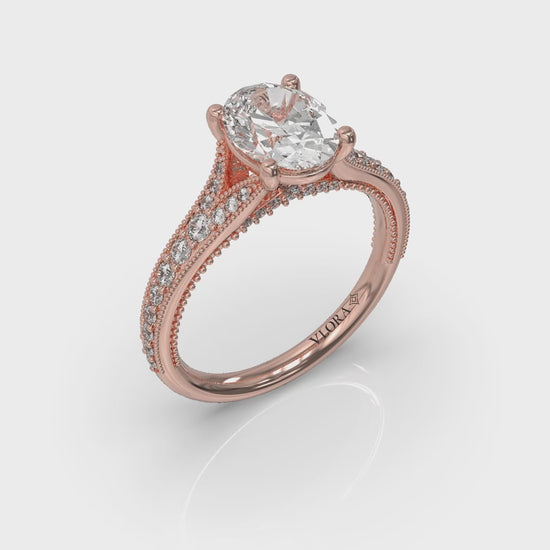 Let love's timeless tale unfold with this vintage-inspired split shank engagement ring. An oval diamond glows within the embrace of Vlora's signature V-shaped setting. Tapered, millegrain-adorned diamonds and a gothic arch grace the profile and band. Every detail in this diamond vintage engagement ring whispers romance and enduring elegance.