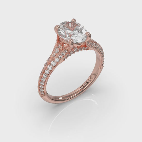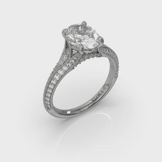 Revel in the timeless beauty of a split shank engagement ring. An oval diamond shines in Vlora's signature V-shaped setting, framed by the open arms of a dimensional diamond band with millegrain details. Arching diamonds adorn the profile, capturing light and hearts. This modern vintage engagement ring is a testament to the enduring appeal of classic romance and exquisite craftsmanship.
