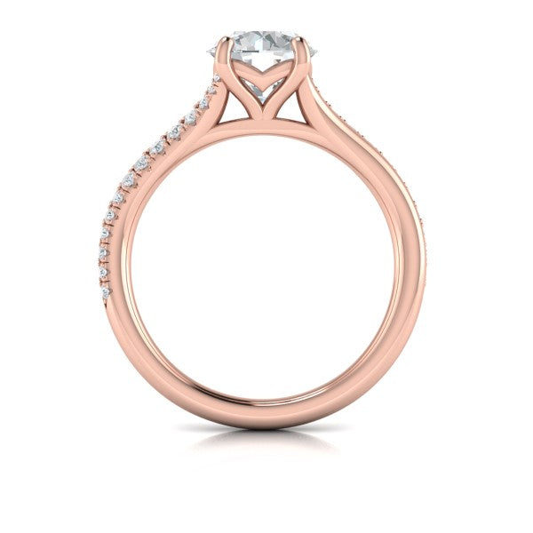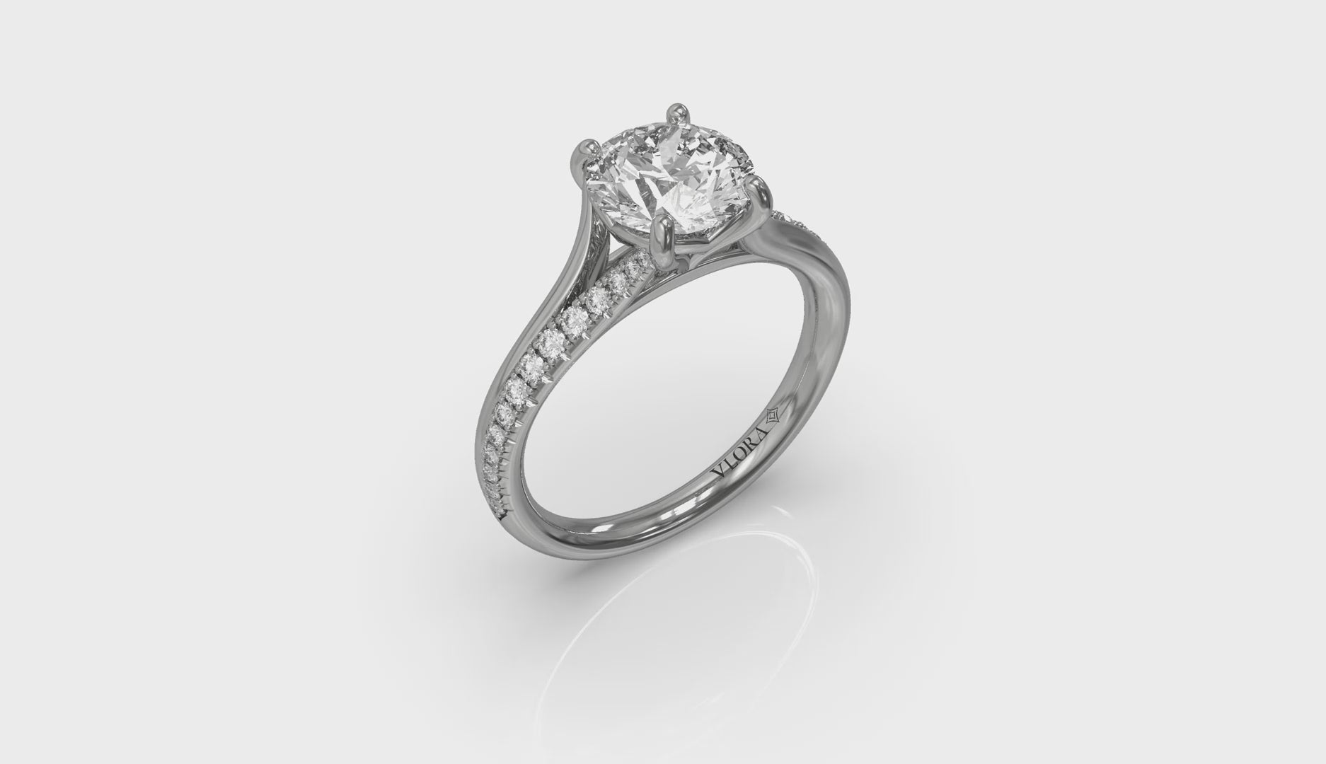 Two paths converge into one romantic love story with this diamond engagement ring with split shank. A single polished strand and a diamond pave strand reverse like a mirror relection, framing the sparkling round center diamond in contrast. The Vlora signature V-shaped setting elevates the center stone, letting love's brilliance dance through each facet. Celebrate your unique journey with a split shank engagement ring that shines as bright as your shared future.