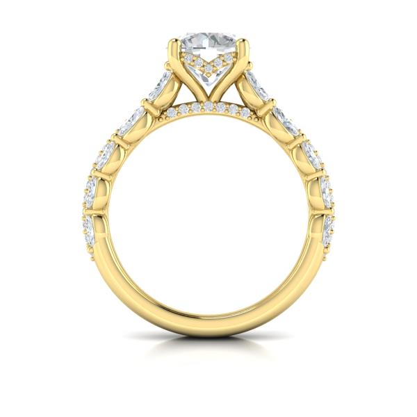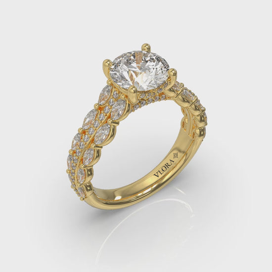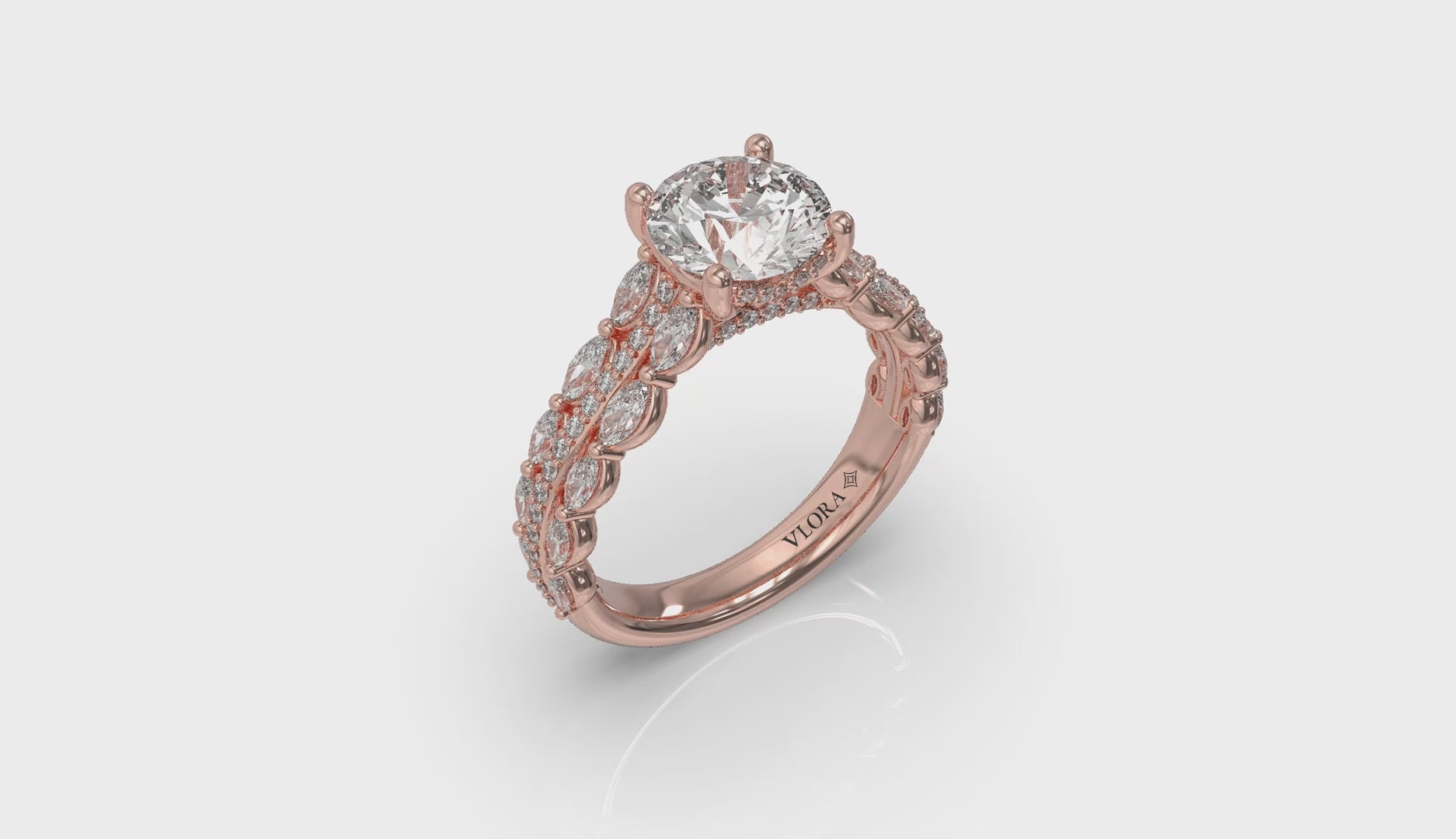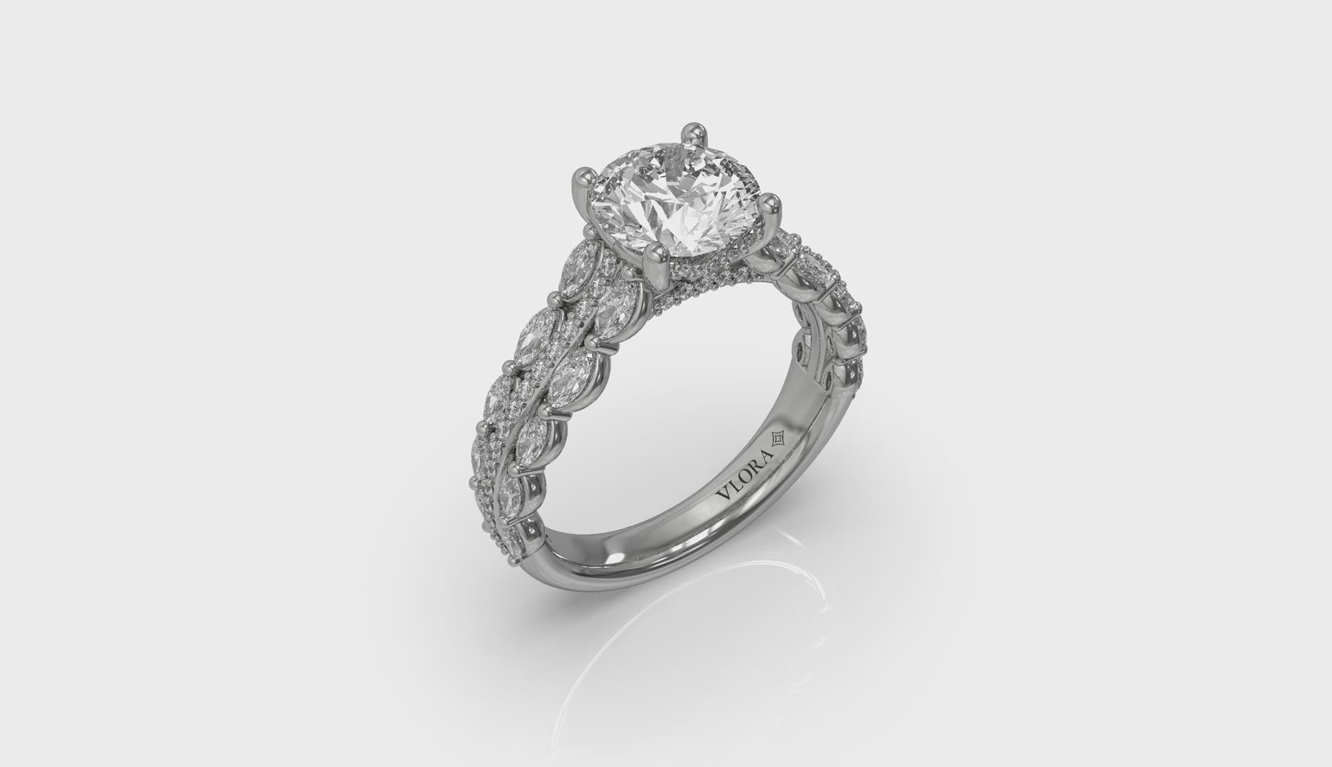 A stunning statement of style, this hidden halo engagement ring features a three-row diamond band with two rows of rhythmic marquise diamonds in harmony The round center diamond is cradled in Vlora’s signature V-shaped setting, drawing in light from every angle. Pave details add radiance to the profile. This unique engagement ring celebrates two souls forever in harmony.