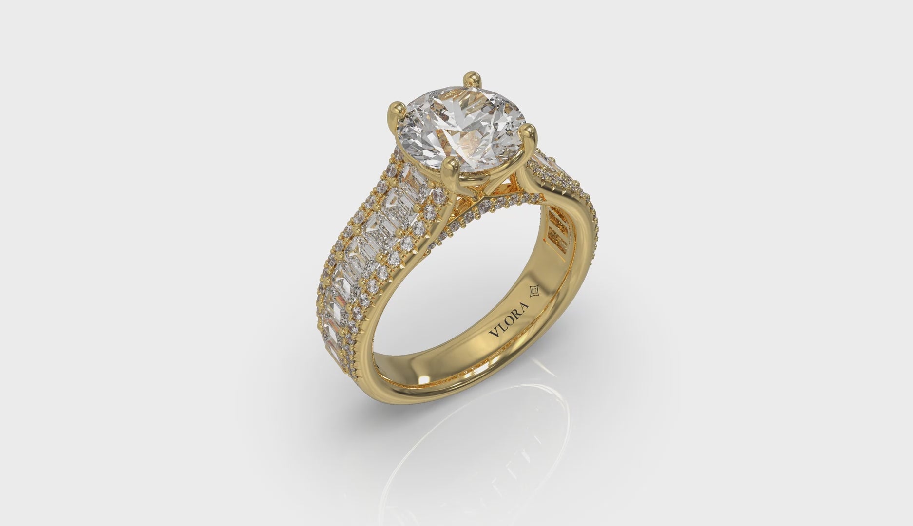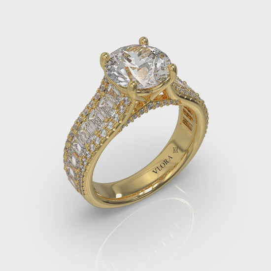 Celebrate your love with this strikingly bold diamond engagement ring. A dazzling oval diamond, set in Vlora's signature V-shaped setting, symbolizes your eternal bond. The cathedral design features a magnificent triple-row band with emerald cuts that glimmer like city lights, flanked by sparkling round diamonds. Exquisite pavé detailing completes this beuatifully crafted masterpiece, creating a breathtaking testament to your unique love story.