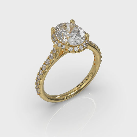 Embrace love at the center of everything with this elegant halo oval engagement ring. The cathedral design gracefully elevates the oval center diamond like a regal crown. The halo peeks out from under the center diamond, adding subtle radiance. This oval halo engagement ring is a celebration of your promise to be true, exquisitely crafted to sparkle with every cherished moment you share.
