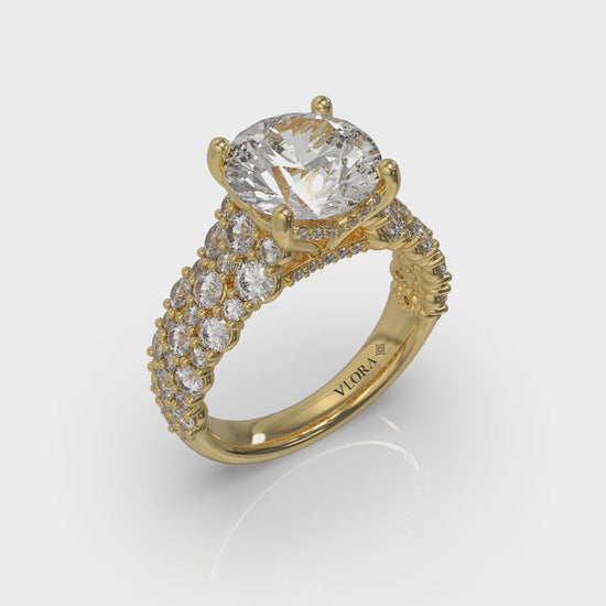 Art to wear. This bold and unique hidden halo engagement ring with a round center diamond will take your breath away. A wide statement band has a gorgeous mosaic of diamonds nestled together like puzzle pieces to create a brilliant cobblestone path of sparkle. It's a romantic tribute to how love takes all the beautiful pieces of two lives and fits them together into a greater whole.