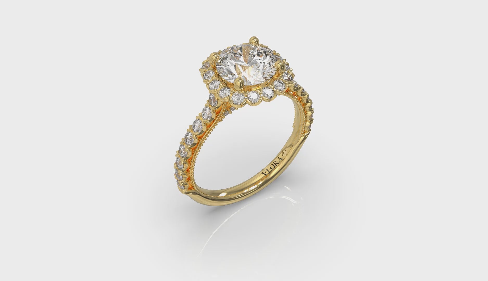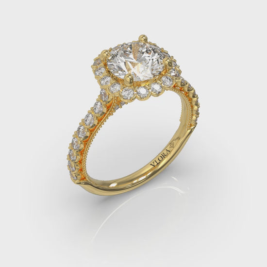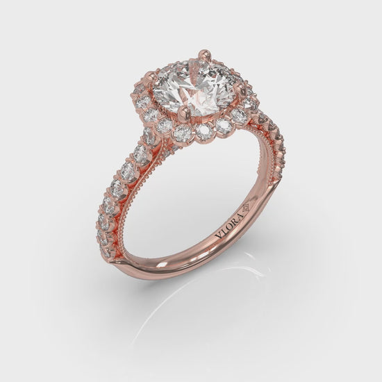 Like a brilliant flower that blooms forever on your finger, this halo engagement ring sparkles from every angle. A classic round brilliant diamond sparkles with brilliance in the center, surrounded by a diamond halo like petals on a flower. Beautifully crafted details like millegrain beading and scalloped settings gives this round engagement ring halo design modern vintage flair. It's sure to be an heirloom for the next generation.