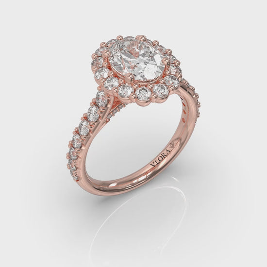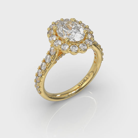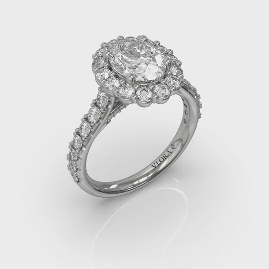 Celebrate your love story with this graceful halo oval engagement ring. The oval center diamond is elegantly elevated in a cathedral setting. A delicate halo embraces the center stone, symbolizing the love at the center of your promise to each other. The diamond band adds timeless sparkle, a promise of the next chapter of the journey of your lives together. This beautifully crafted unique engagement ring is a timeless emblem of romance and commitment, designed to sparkle with every cherished moment you share.