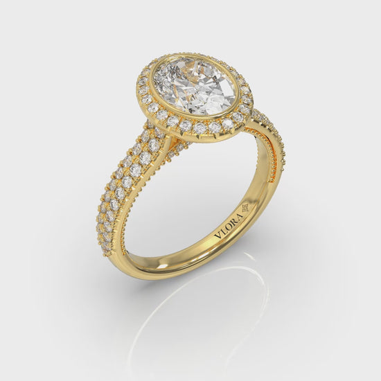 Embrace elegance with this captivating modern vintage engagement ring. The graceful curves of an oval diamond shine within the frame of a bezel, surrounded by a brilliant pave halo that enhances its charm. The double row pavé band shimmers like stardust. Each carefully crafted intricate detail of this oval bezel engagement ring celebrates the timeless power of love.