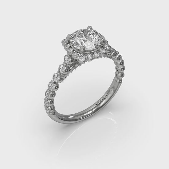 This exquisite diamond halo engagement ring is a testament to timeless elegance. A brilliant round diamond takes center stage, framed by a cushion-shaped halo that adds vintage charm. The meticulous craftsmanship of the floating diamond halo and band sparkles like magic. This ring reflects the beauty of your past and future love story, a token of your enduring commitment to love each other forever.