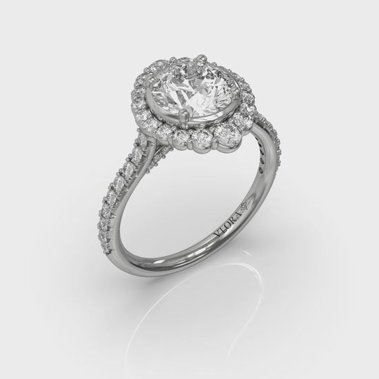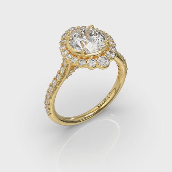 An ode to timeless romance, this gorgeous diamond halo engagement ring sparkles with elegance. The round center diamond is bezel set and embraced by a unique halo with two brilliant capstone diamonds facing each other. With balance and grace, this beautifully crafted engagement ring is a romantic symbol of love between equals.