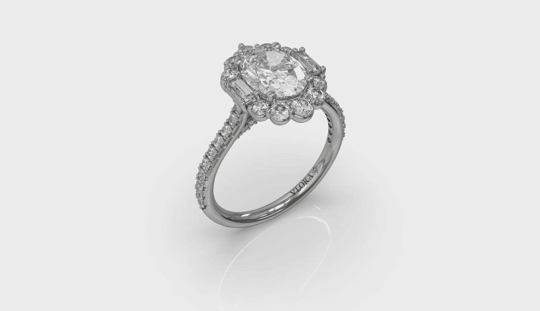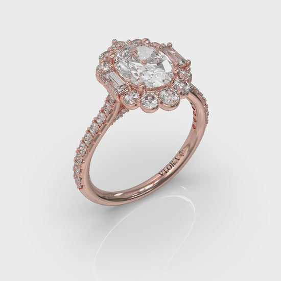 Your love story is reflected brilliantly in this unique halo oval engagement ring style. An elegant oval center diamond is framed by a unique halo with baguette diamonds on each side, symbolizing the vows you make to each other. A diamond band with woven details on the profile adds even more elegance. This beautifully crafted unique engagement ring style combines glamor and innovation in a fitting tribute to a brilliant shared future.