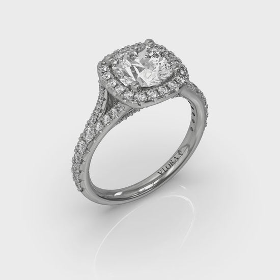 A dazzling tribute to love, this halo diamond engagement ring features a round center diamond embraced by a vintage-inspired cushion-shaped halo, exuding timeless brilliance. The split shank band, adorned with shimmering diamonds, symbolizes the harmony of two lives becoming one. Each detail is meticulously crafted to capture light, making this romantic unique engagement ring design a symbol of enduring commitment.