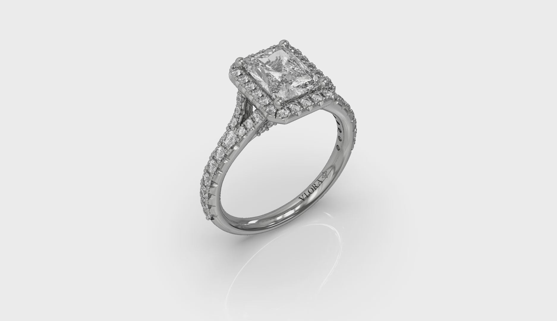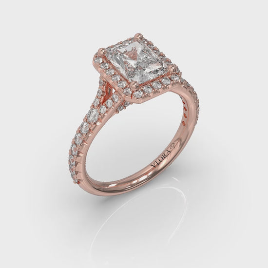An artful dance of geometry and romance, this unique engagement ring features an emerald-cut center stone framed by a sparkling halo. The split shank diamond band adds balance and grace to the design. Woven pavé detailing on the profile celebrates the intertwined journey of two lives. A tribute to modern elegance and meticulous craftsmanship, this beautiful emerald cut engagement ring symbolizes the beginning of your bright future together.