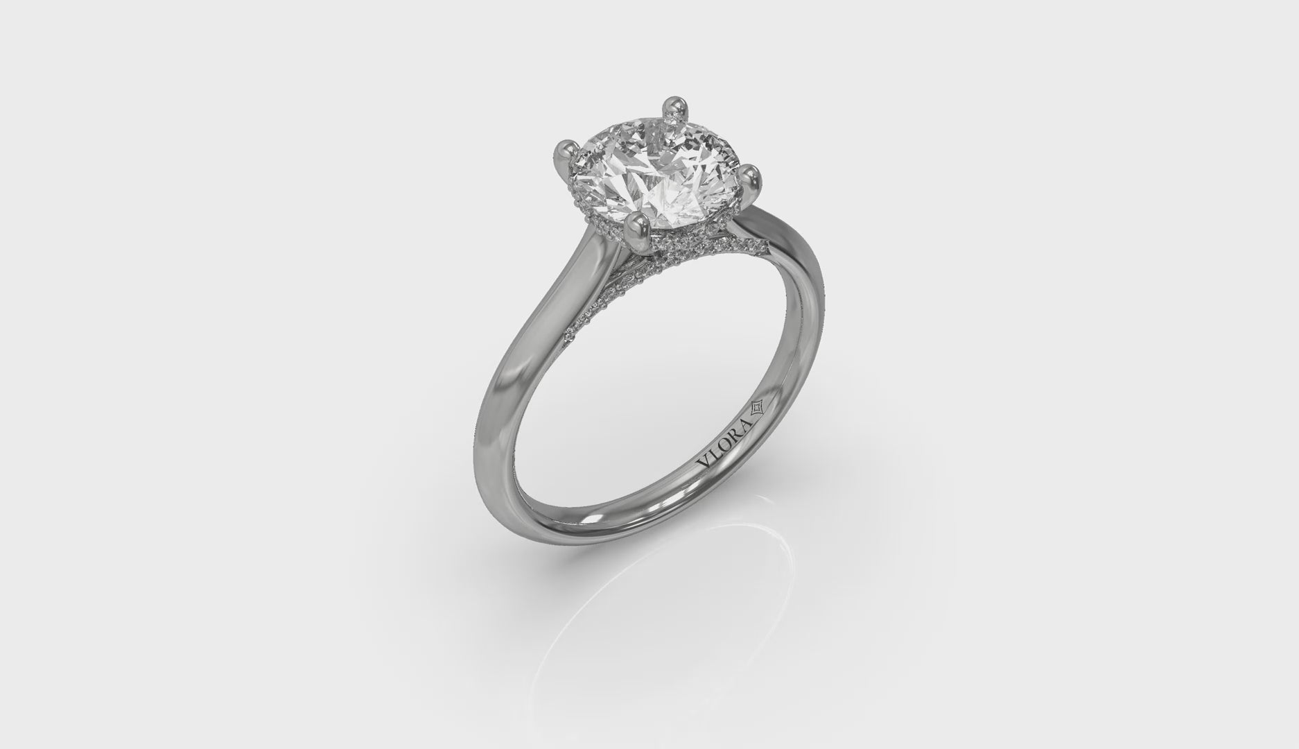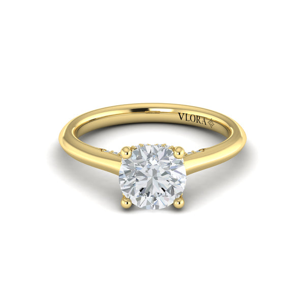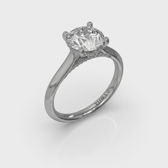 A love story told through brilliance, this classic solitaire engagement ring showcases a mesmerizing round diamond raised to catch the light in Vlora's signature V-shaped setting. A hidden halo sparkles beneath the center diamond, while accent diamonds embellish the profile, an ode to beautiful craftsmanship you'll enjoy forever. An enduring symbol of commitment, this simple classic engagement ring promises a lifetime of romance.