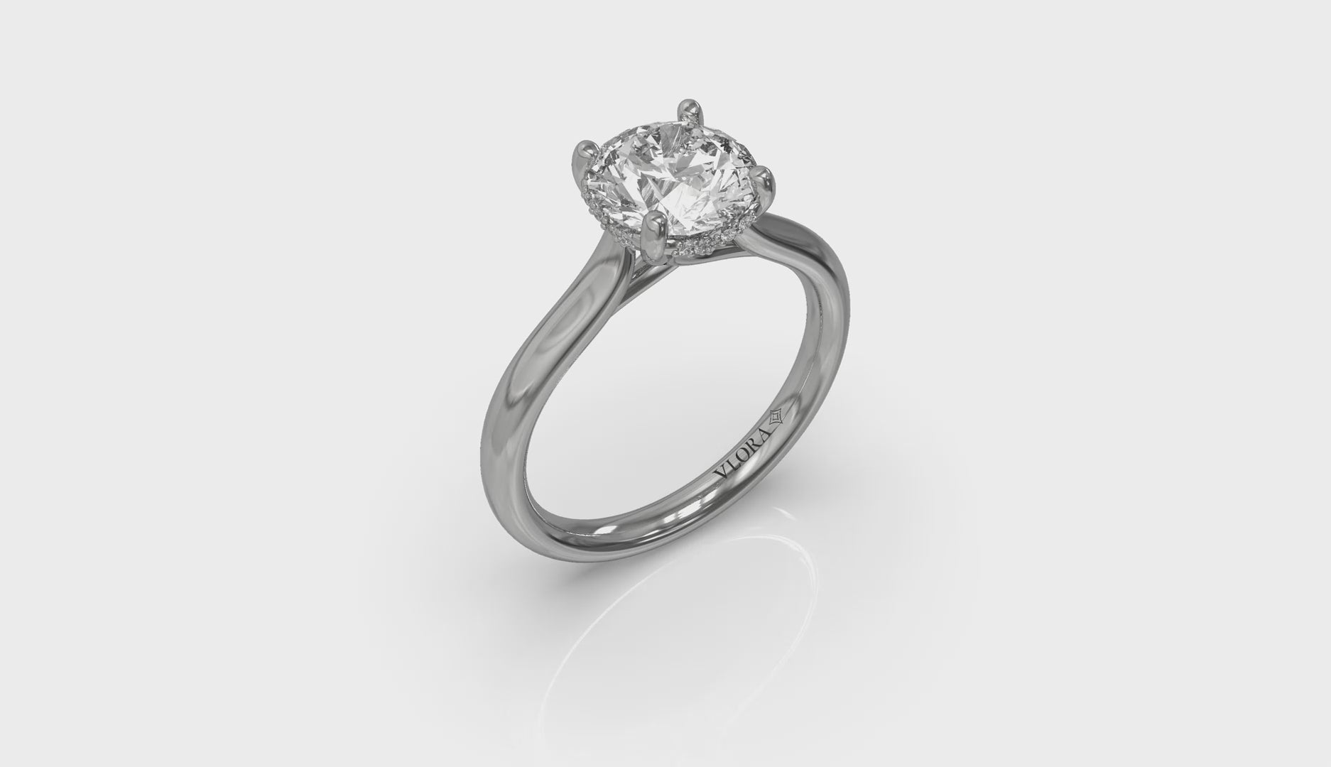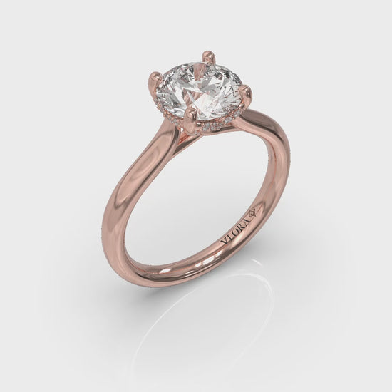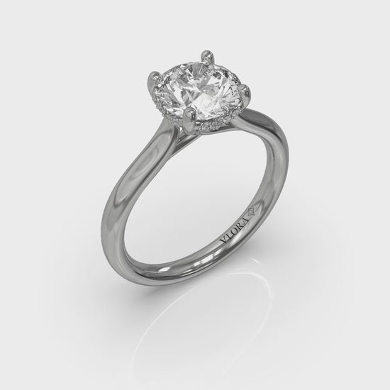 Simply elegant, this solitaire engagement ring showcases a round center diamond in Vlora's signature V-shaped cathedral setting, which captures light from all angles. A hidden halo offers an unexpected touch of private brilliance. With its timeless design and meticulous detailing, this simple classic engagement ring is a refined symbol of commitment, promising a brilliant future filled with love.