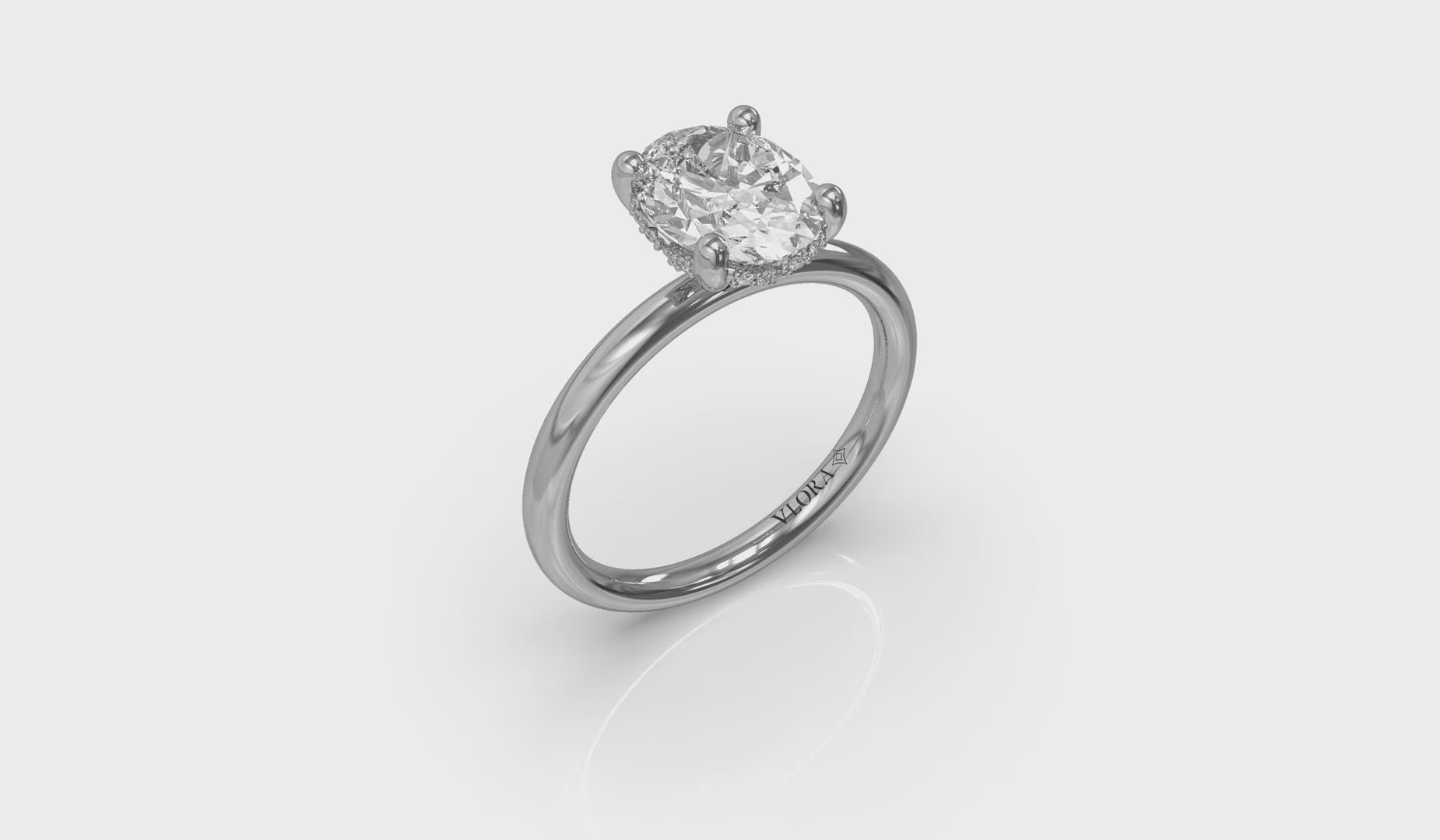 Experience a promise captured in elegance forever. This classic perfect fit engagement ring stacks gracefully with your wedding band. The captivating oval center diamond, gracefully held in Vlora's signature V-shaped setting, invites light and brilliance to dance in every facet. With a delicate hidden halo adding depth and sparkle, this ring epitomizes a love that shines from the inside out. This beautifully crafted solitaire oval engagement ring is the ultimate symbol of a romance destined to last.