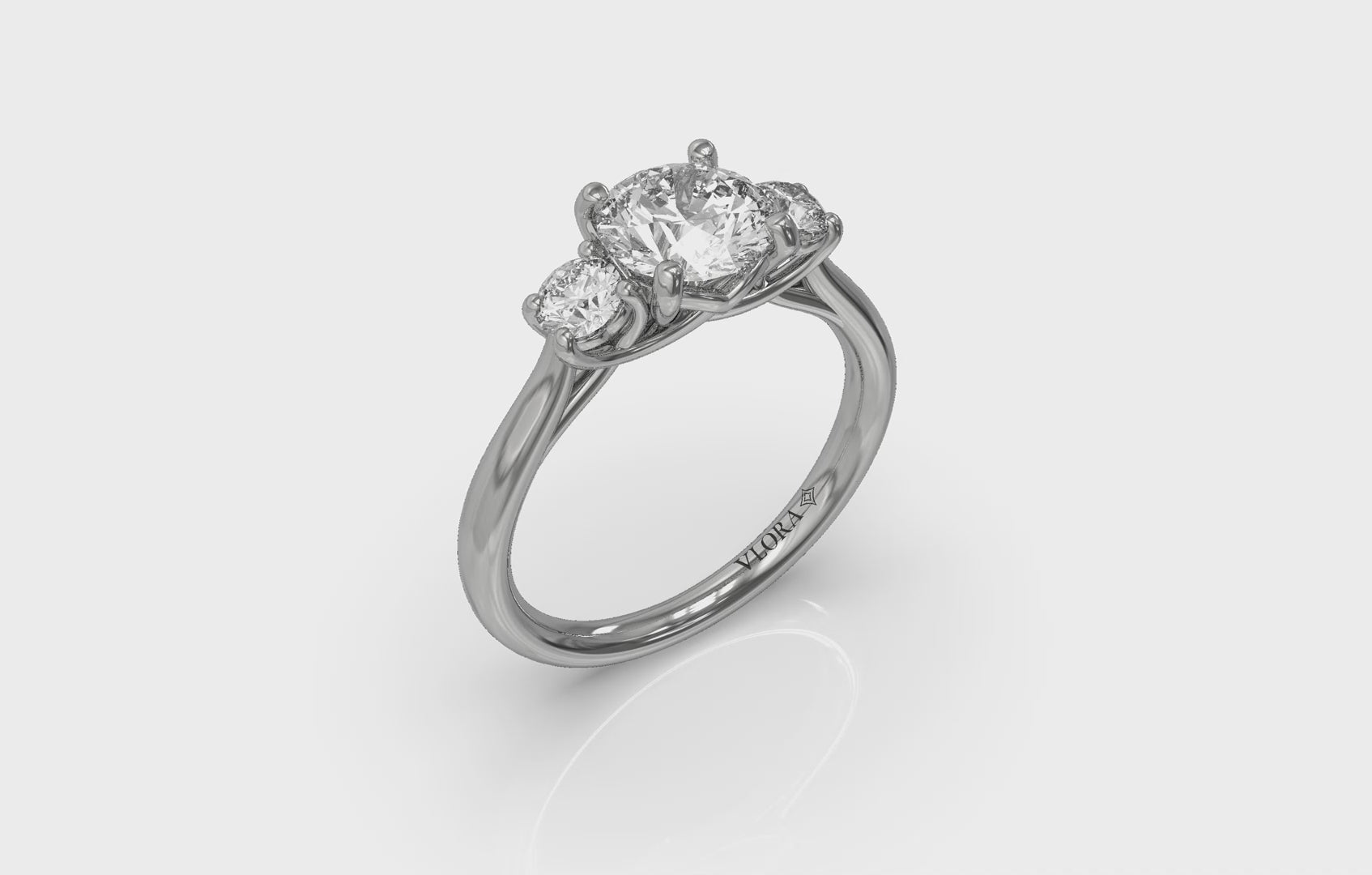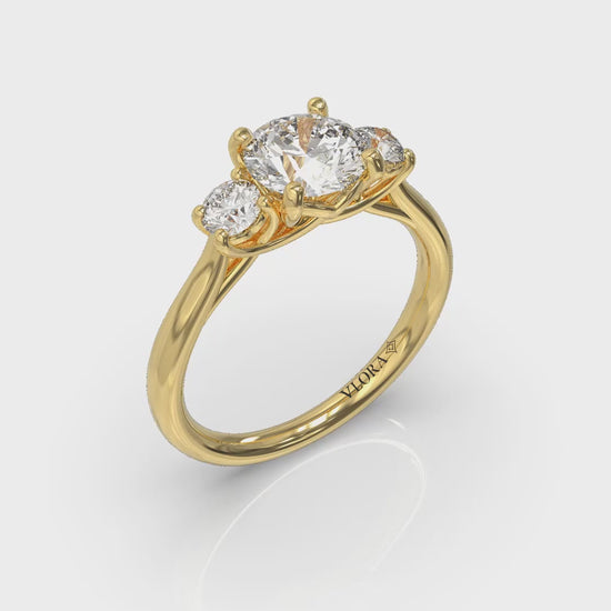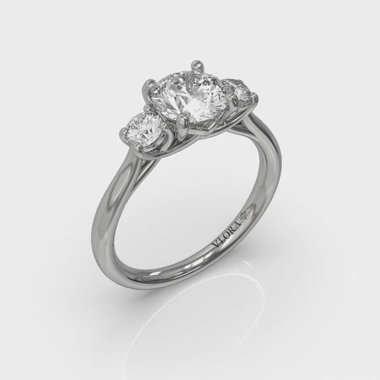 This captivating three stone engagement ring weaves your love story into its intricate design. Three perfectly harmonized diamonds mirror the past, present and future of your love story. A brilliant round center diamond takes center stage, flanked by two sparkling companions. The interlaced setting symbolizes the intertwining of two lives, creating a tapestry of romance and commitment. Each delicate curve and elegant twist promises a shining future together.