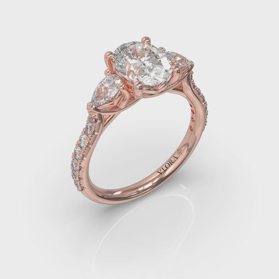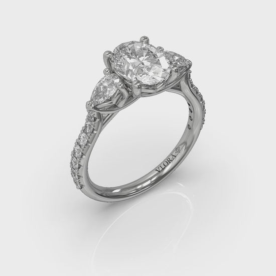 Elegant curves grace this romantic three stone engagement ring that celebrates the past, present and future of your love story. Two pear shape diamonds point the way to the center oval shape diamond, embracing its sophisticated elongated shape in brilliance. An intricately interwoven setting symbolizes two lives joined into one. A beautifully crafted diamond band sparkles from every angle. A testament to your unique love story, this stunning three stone engagement ring promises a lifetime of shared dreams and lasting happiness.