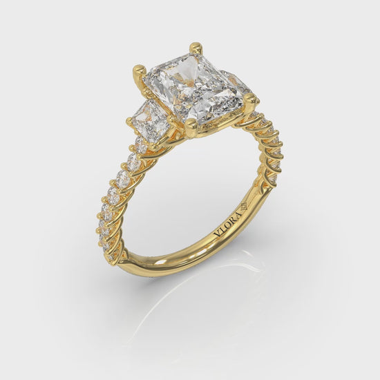 This elegant three stone engagement ring weaves a narrative of love and commitment. The center emerald cut diamond is flanked by two emerald cut side diamonds, like a brilliant hall of mirrors. The intricate woven setting, like an eternal embrace, elevates the sparkling diamond band, allowing light to dance across each facet. This romantic design symbolizes the strength and unity of your bond, capturing the essence of a love that is as timeless as it is unique.
