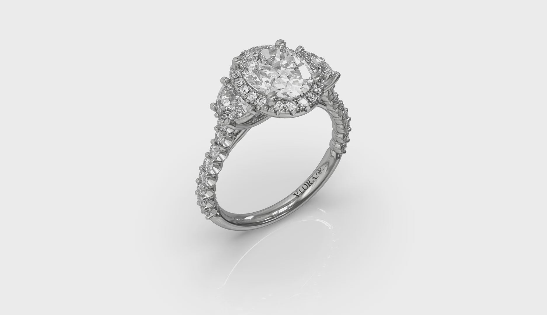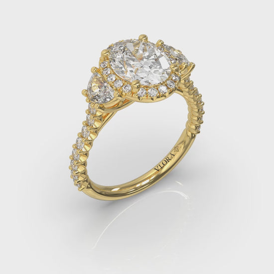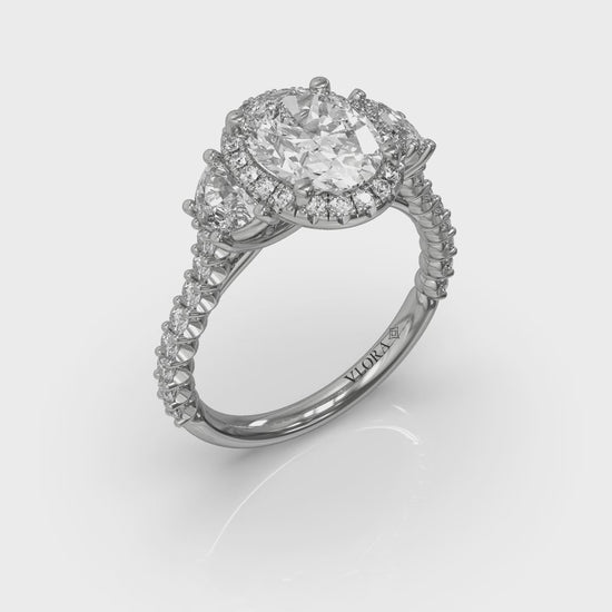 Embrace eternal love with an oval halo three-stone engagement ring. An exquisite oval diamond gleams at its heart, surrounded in the embrace of a brilliant halo. Half moon diamonds on each side symbolize how your love makes you feel like two halves of a whole. Exquisitely crafted, this halo oval engagement ring is a unique testament to your timeless commitment.
