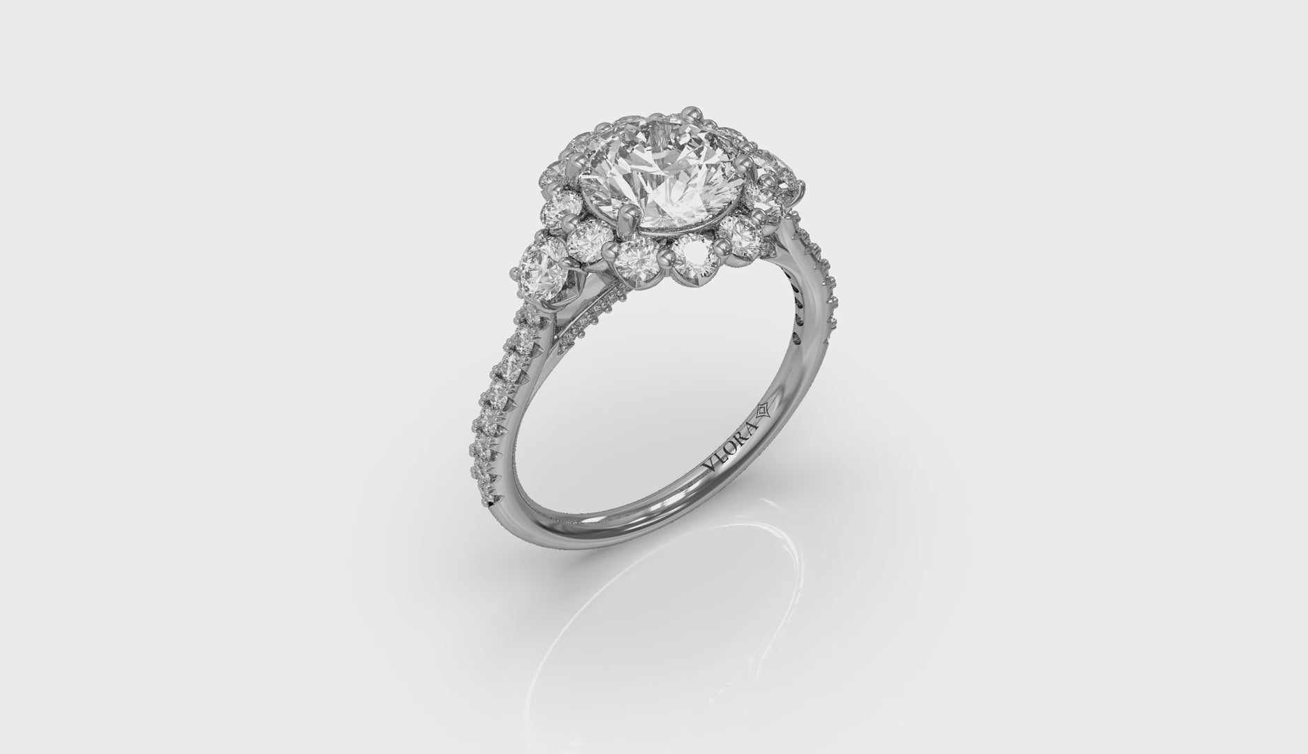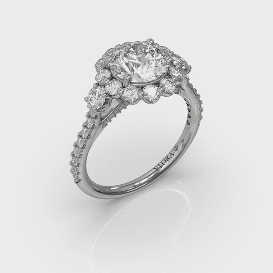 Blooming with romance, this diamond halo engagement ring captures love's essence. A mesmerizing round center diamond, embraced by a floral halo, dances in dazzling light. Round side stones symbolize a journey shared, while a diamond band forms a sparkling promise of eternity. Crafted with delicate elegance, this ring is ready to become a cherished heirloom, celebrating the timeless beauty of commitment and the blossoming of two hearts into one.