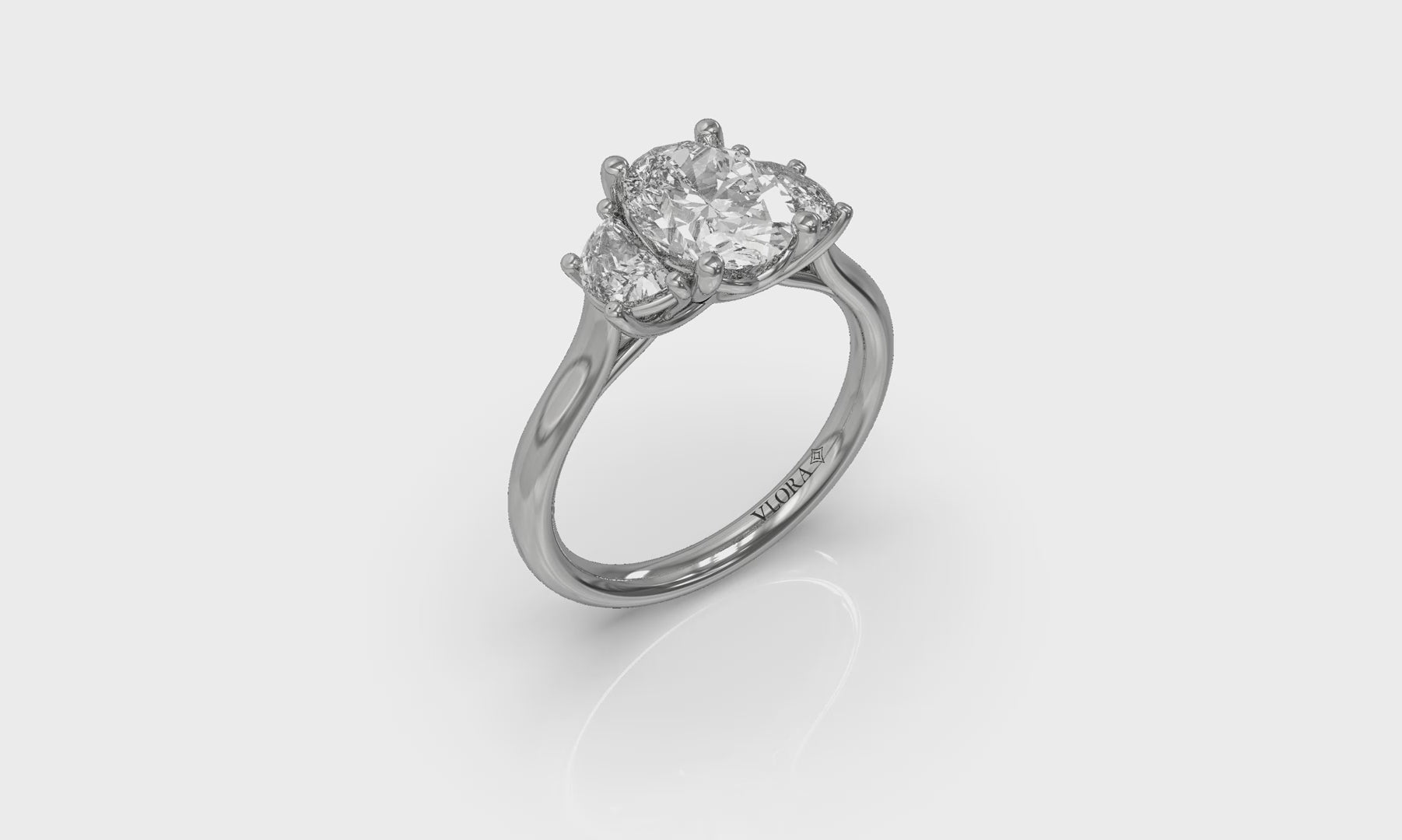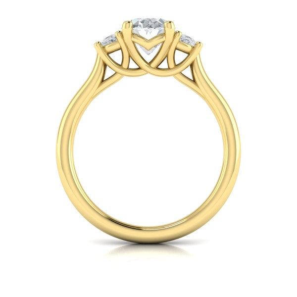 Two halves make a whole in this romantic three stone engagement ring. A graceful oval diamond is embraced by two half moon diamonds that come together in a brilliant promise, symbolizing your love story. The woven setting intertwines like your future together, creating a beautifully intricate profile. This gorgeous trilogy engagement ring captures the essence of two souls becoming one, crafting the perfect prelude to a lifelong journey of love.