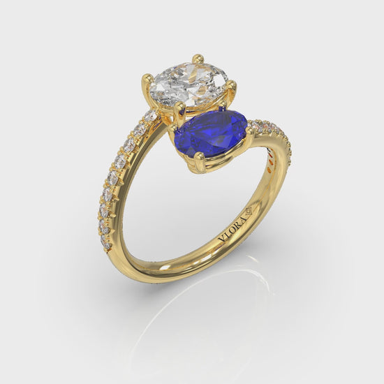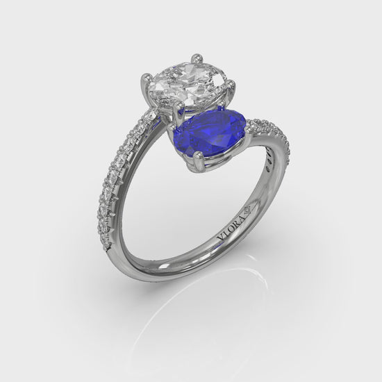 Two become one in this romantic engagement ring that speaks volumes in the language of gems. A soulful blue sapphire says "true" and a sparkling diamond says "forever." Inspired by the vintage toi et moi ring that Napoleon gave Josephine in one of history's great love stories, this romantic two stone engagement ring is a stunning statement of devotion. A radiant diamond band reflects the brilliance of a shared life. Designed for the couple whose love is a true forever partnership, this ring is a perfect celebration of connection.