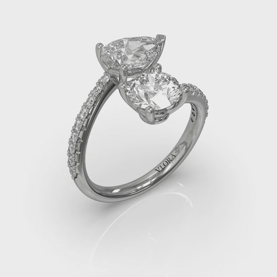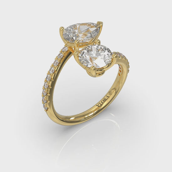 Two diamonds, two hearts, one extraordinary journey. This toi et moi engagement ring elegantly intertwines a round and a pear-shaped diamond in a poetic embrace. The bypass design captures the endless dance of love, as a shimmering diamond band symbolizes your love story. Set in harmony, this ring reflects your unique bond, balancing individuality and unity in a mesmerizing celebration of two souls becoming one.