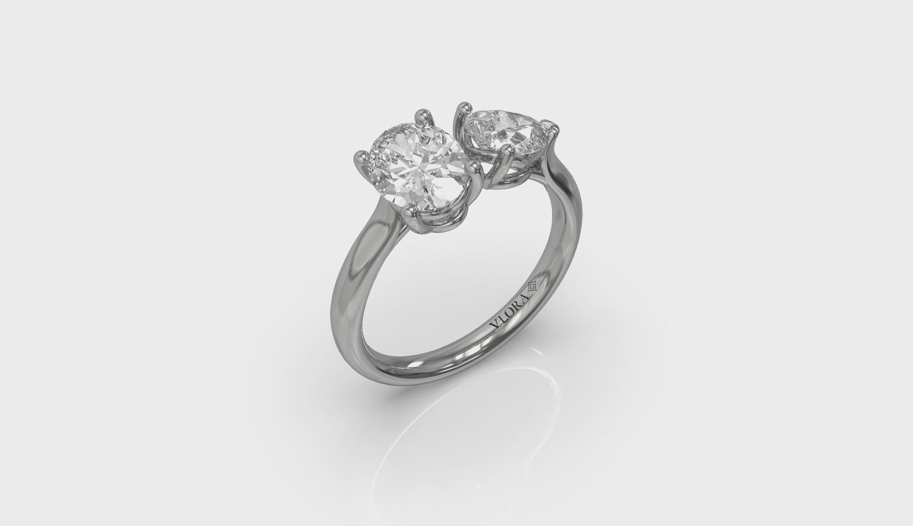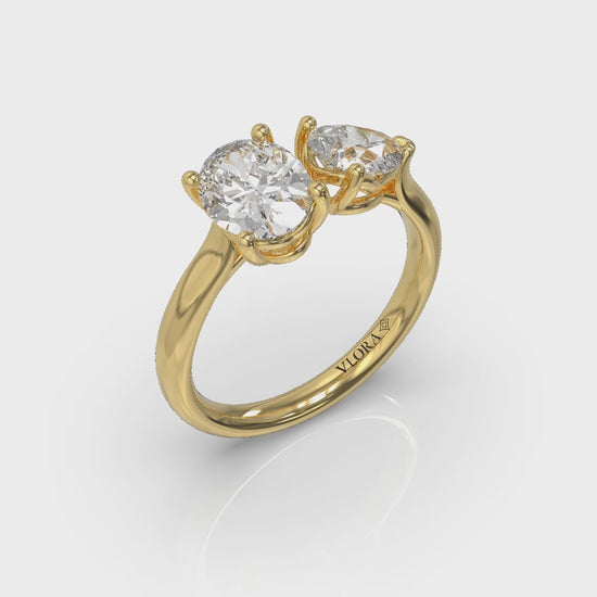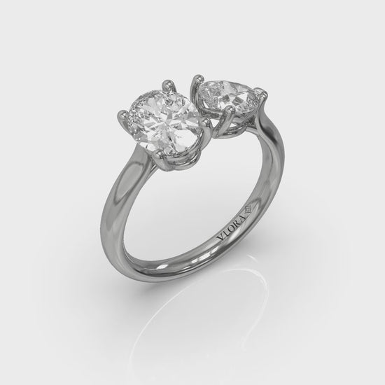 Two hearts, two souls—one love. This stunning toi et moi engagement ring features an elegant oval and a delicate pear-shaped diamond, meeting in the center like a romantic embrace of shared brilliance. The polished band gracefully supports each diamond, echoing the harmonious balance of a perfect partnership. This exceptional design celebrates the uniqueness of your journey, a shining promise of love everlasting.
