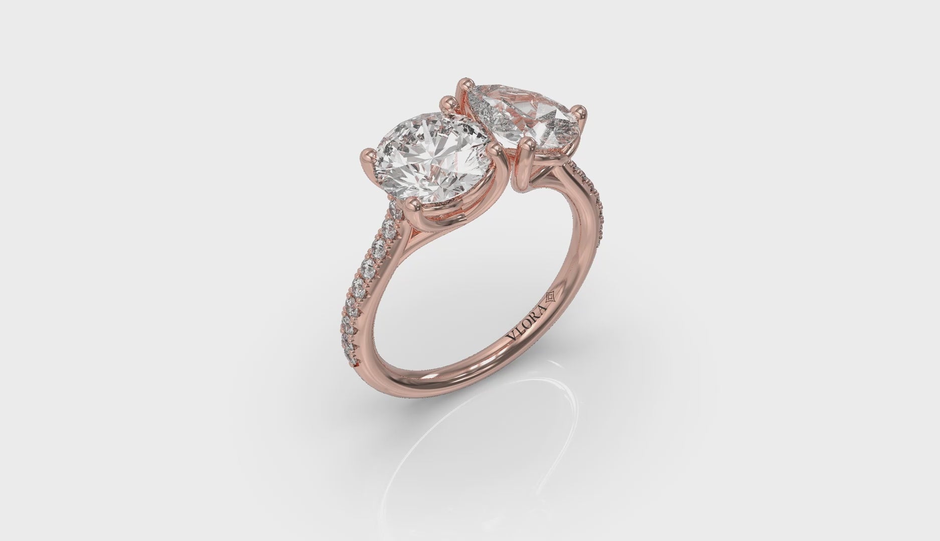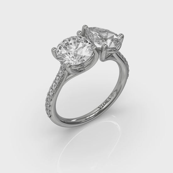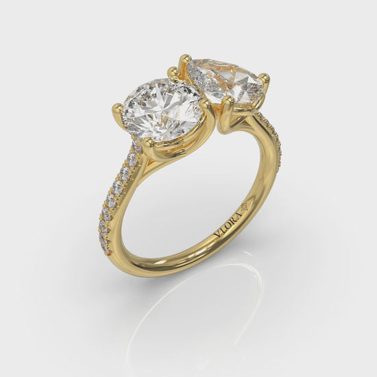 A symbol of two souls meeting as one, this exquisite toi et moi engagement ring pairs a brilliant round diamond with a captivating pear-shaped counterpart. These stunning center diamonds converge in a delicate dance, mirroring the unique bond of your love. A diamond studded band represents your journeys to arrive at this moment of promise, each facet of brilliance a celebration of true partnership.