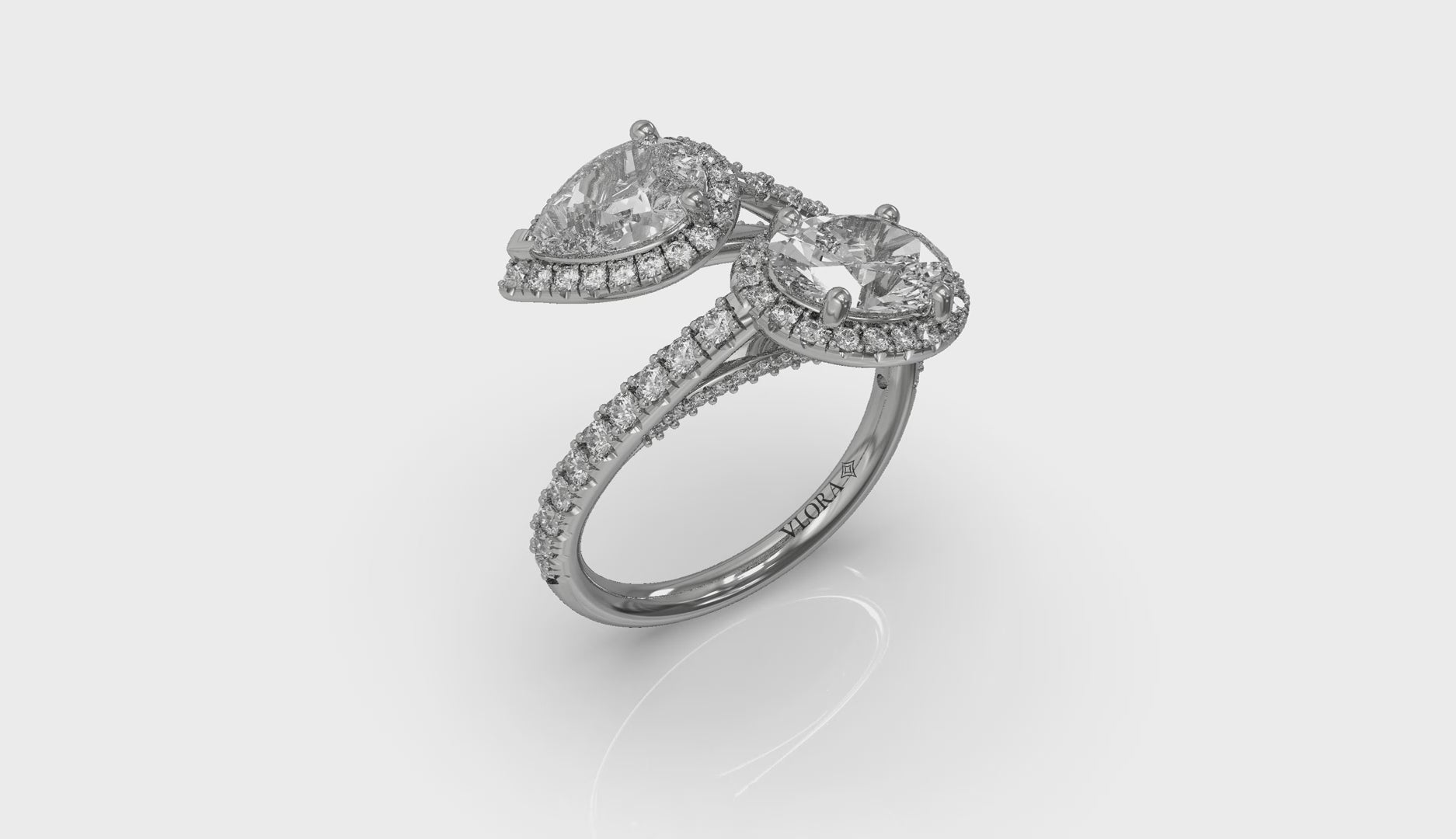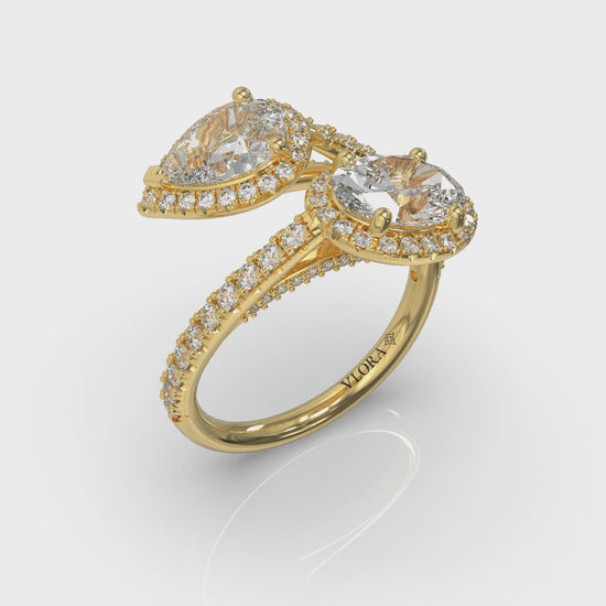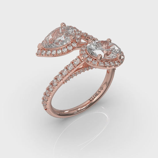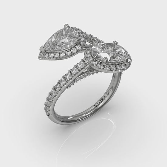 Unique and captivating, this unique two stone engagement ring tells the story of your bond. The pairing of oval and pear shaped diamonds, embraced by delicate halos, captures the romance of two souls joined as one. The artful bypass setting of this toi et moi engagement ring gracefully symbolizes your intertwined journey of love. The diamond band adds a trail of brilliance, a perfect celebration of a one of a kind love.