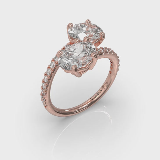 In an elegant embodiment of shared love, this toi et moi engagement ring showcases two oval diamonds, like two souls joined in a loving embrace. Meeting in a brilliant kiss in the center of this romantic design, these two graceful gems reflect the forever bond you share. A sparkling diamond band enhances the brilliance, creating a perfect circle of light across your finger. This eloquent two stone engagement ring promises a lifetime of shared dreams and unwavering commitment.
